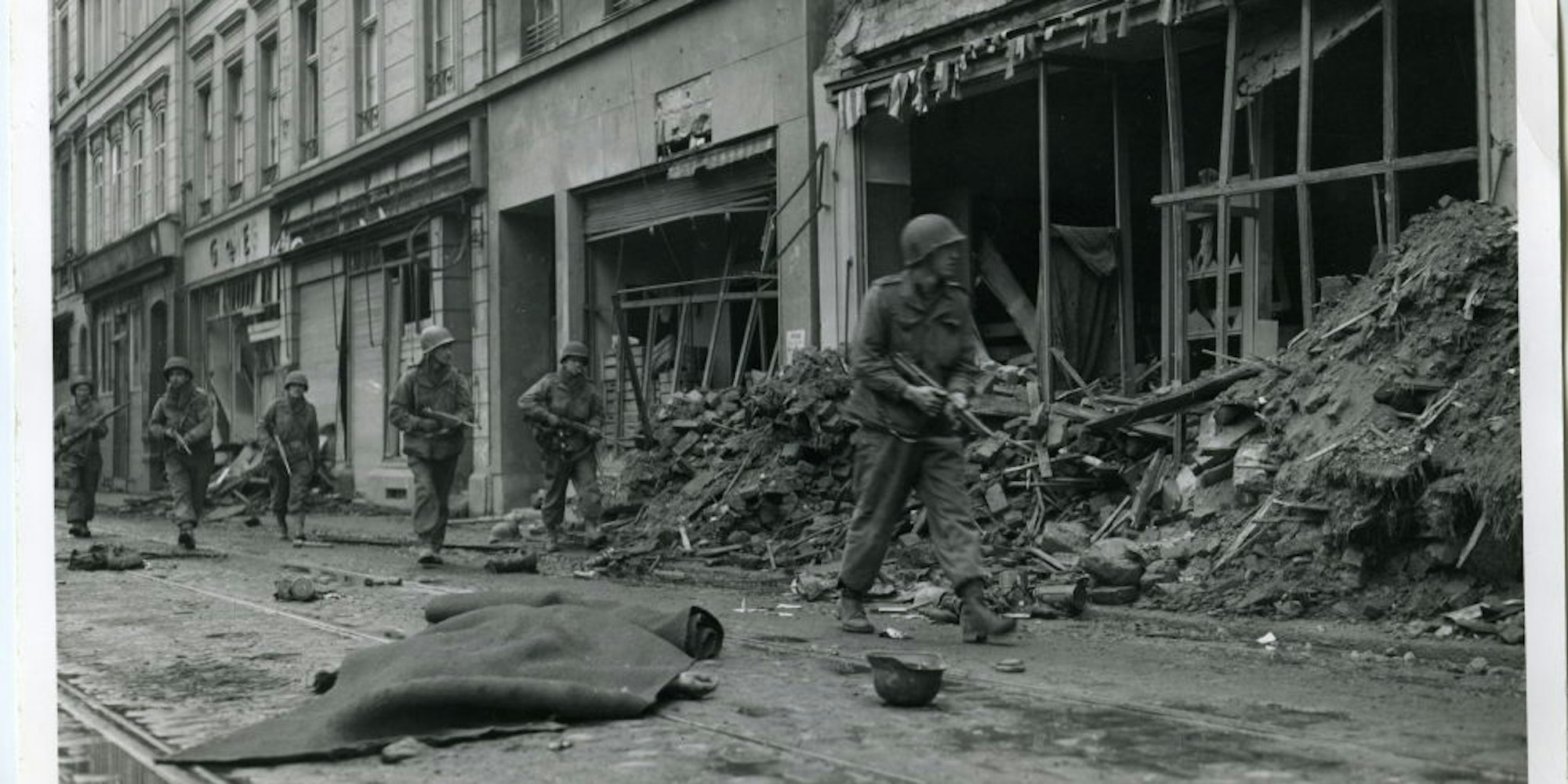 Bonn – Noch 25 Kilometer bis Bonn zeigt ein Wegweiser, den amerikanische Soldaten passieren, als sie im März 1945 auf die Universitätsstadt am Rhein vorrücken. Sie gehören zum 23. Regiment der 2. Infanteriedivision. Am 4. März wird Rheinbach fast kampflos genommen, am 6. März Alfter und Mechernich. Kriegsberichterstatter filmen Zivilisten, wie sie Baumstämme wegrollen, die als Panzersperren auf die Straße geworfen worden waren. Kurz zuvor ist Meckenheim durch heftigen Beschuss schwer zerstört worden. Am 7. März sind die Truppen der 1. US-Armee in Brühl, der Westflügel des kurfürstlichen Schlosses erhält durch Artilleriebeschuss einen Volltreffer.