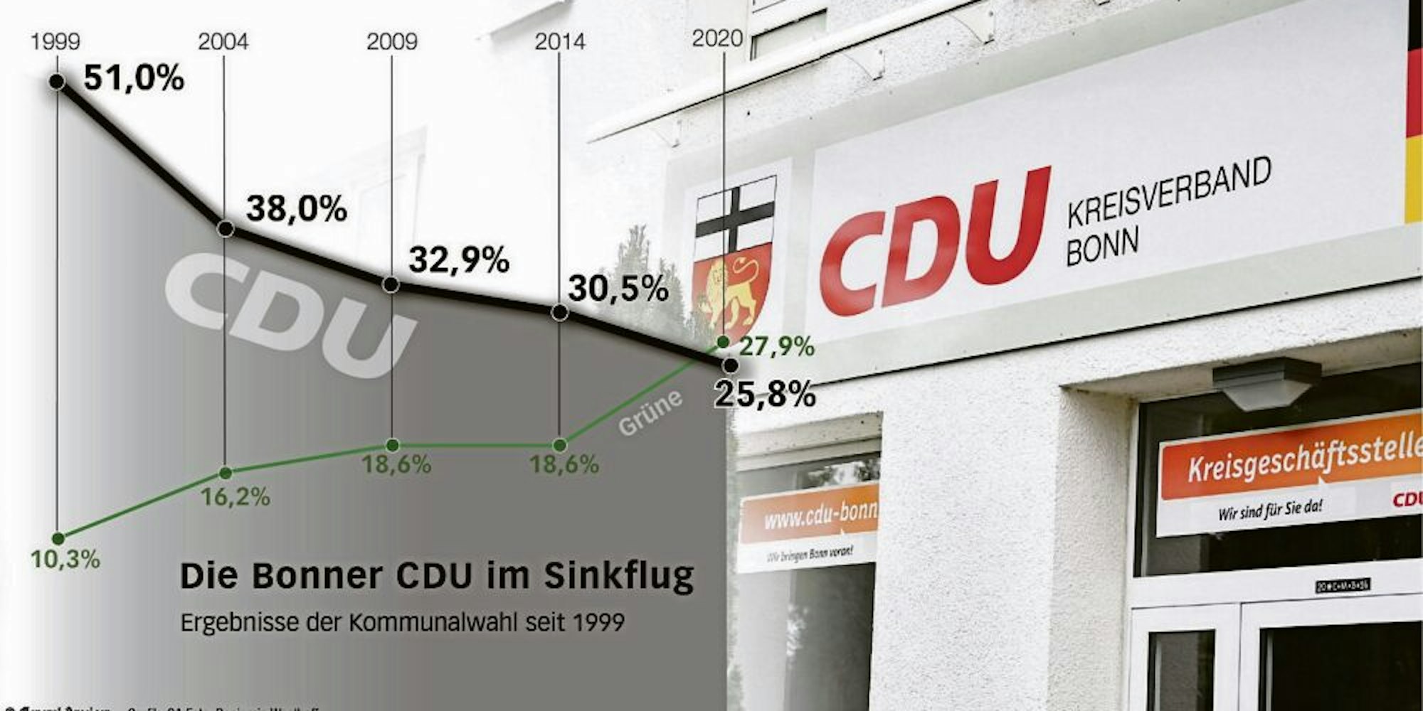 In nur 15 von 33 Wahlbezirken konnten die CDU-Kandidaten das Direktmandat für die Partei holen. Und in vermeintlich bürgerlich geprägten Stadtteilen wie Friesdorf (knapp 24 Prozent), Dottendorf (knapp 23 Prozent) oder Castell (knapp 22 Prozent) nähert sich die Union bedrohlich der 20-Prozent-Marke.