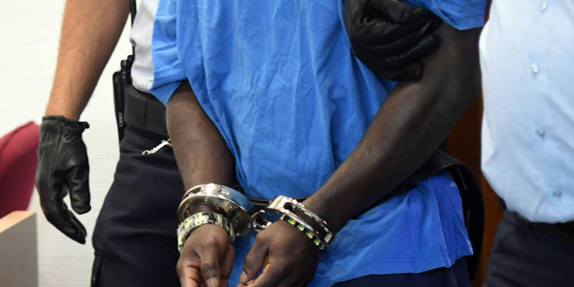 Der Angeklagte wird an Händen und Füßen gefesselt in den Gerichtssaal geführt.
