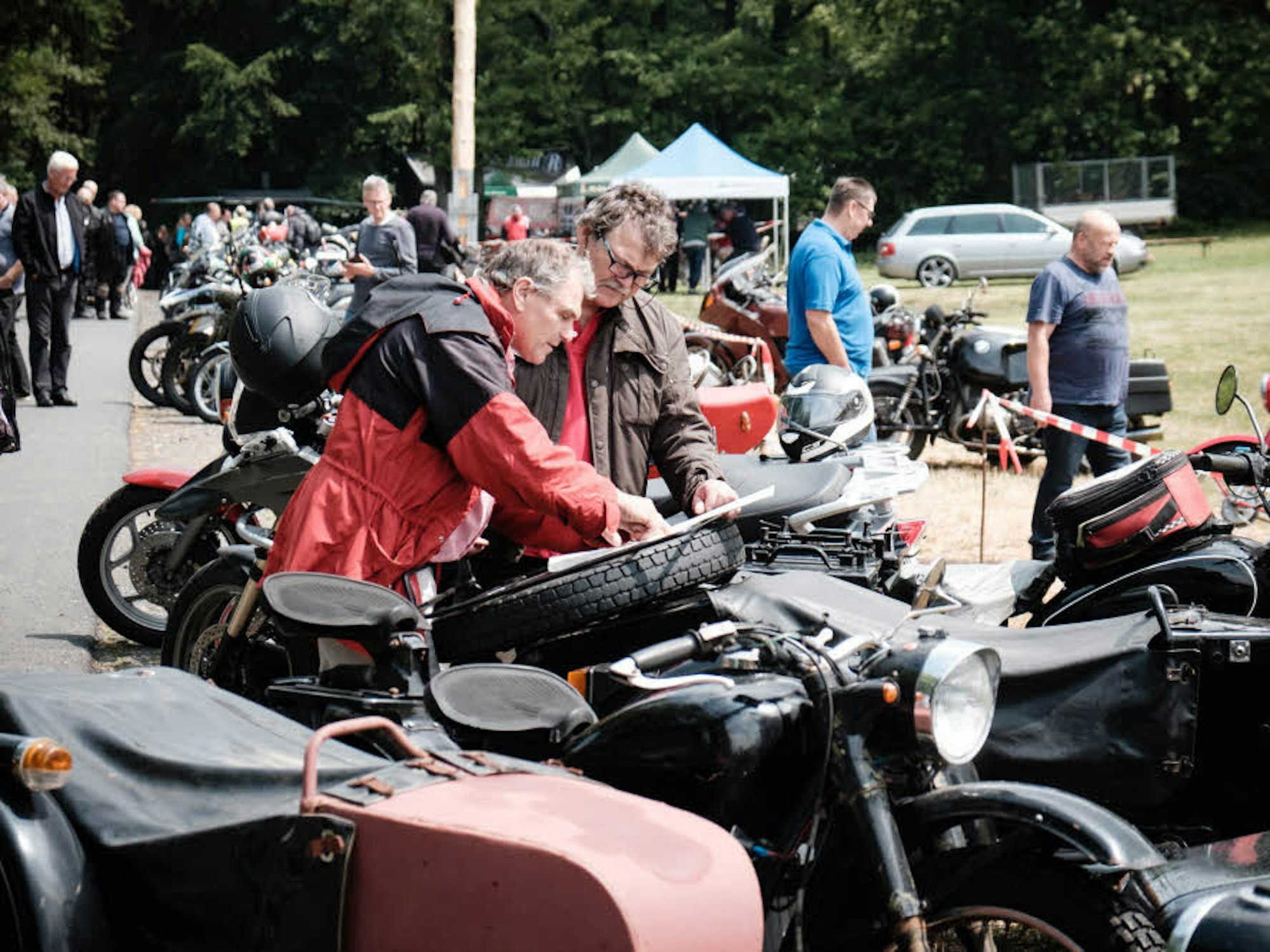 Mit 65 Jahren ist auch die NSU Max, eine glänzend schwarze Maschine mit Beiwagen, ein echter Oldtimer. Sie verfügt über einen Ventiltrieb mit Schubstangen, wie bei einer Dampflok. „Mein Mann hat mich mit seiner Leidenschaft für Motorräder angesteckt“, erklärt Besitzerin Maike Jung (60). Mittlerweile hat das Ehepaar sechs Maschinen in der heimischen Garage stehen. Regelmäßig tauschen sie sich auf Treffen wie dem in Kölsch-Büllesbach mit anderen Bikern aus.