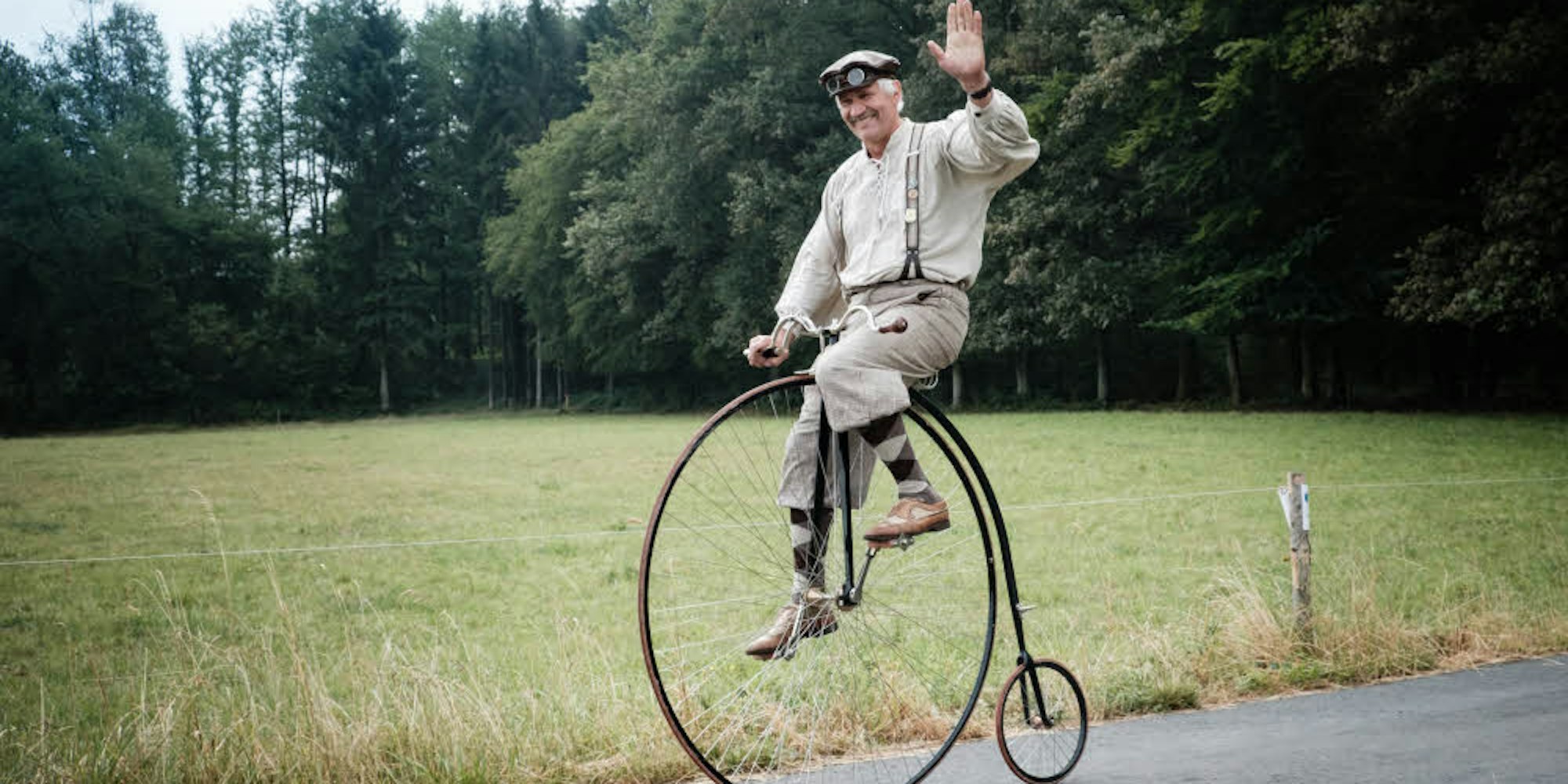 Mit seinem Hochrad zog Gerd Jajschik aus Bad Honnef beim Oldtimer-Treffen der Veteranen-Freunde Siebengebirge viele interessierte Blicke von anderen Teilnehmern sowie von schaulustigen Spaziergängern auf sich.