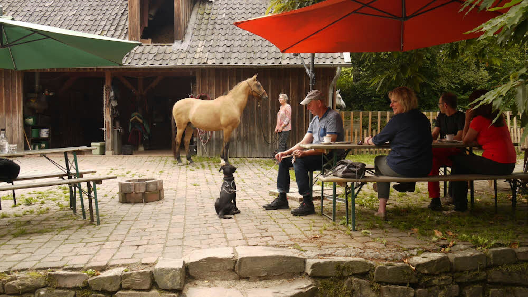Umringt von Weiden ist ein kleiner Reiterhof entstanden. „Ich habe einen Ort gesucht, der sich als Standort für eine Reitschule eignet“, sagt sie. Eva Köhler kam aus dem westfälischen Hagen nach Hennef, wo sie nahe Bödingen ihre Wanderreitstation und eine Reitschule betreibt. Dass sie sich seit drei Jahren auch gastronomisch betätigt, war eine eher aus der Not geborene Entscheidung. „Nach einem Reitunfall dachte ich zunächst, dass ich mein Engagement mit den Pferden dauerhaft stark einschränken muss und habe nach einer weiteren Beschäftigung gesucht“, sagt die 61-Jährige. 2014 eröffnete sie ihr kleines Hofcafé. Mittlerweile ist die Schulter belastbarer, so dass Eva Köhler ihre Arbeit mit den Pferden fortsetzt. Das einmal wöchentlich geöffnete Café betreibt sie dennoch weiter.