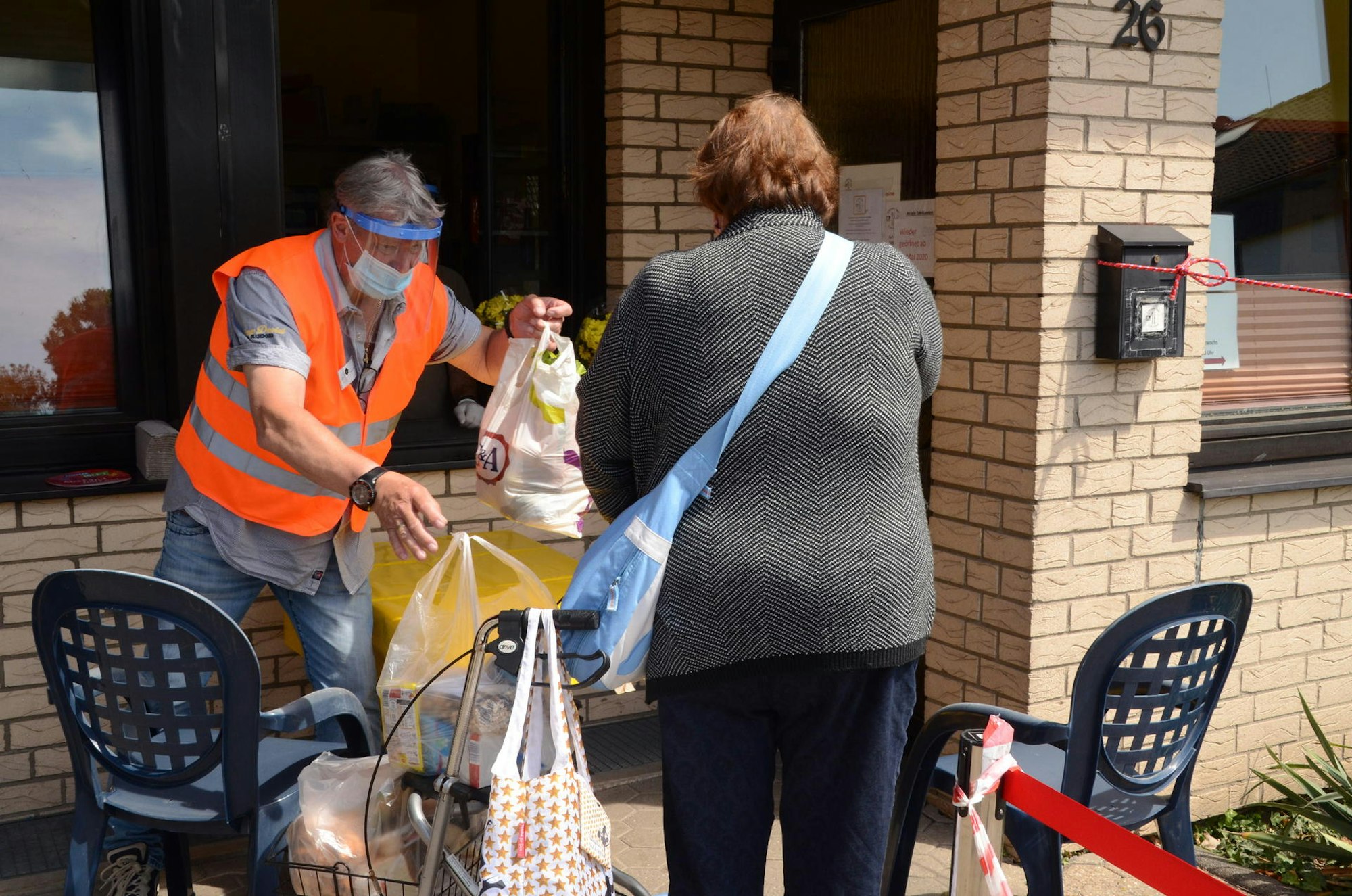 Nur mit Mund- und Nasenschutz begegneten sich Helfer und Kunden in Lohmar.
