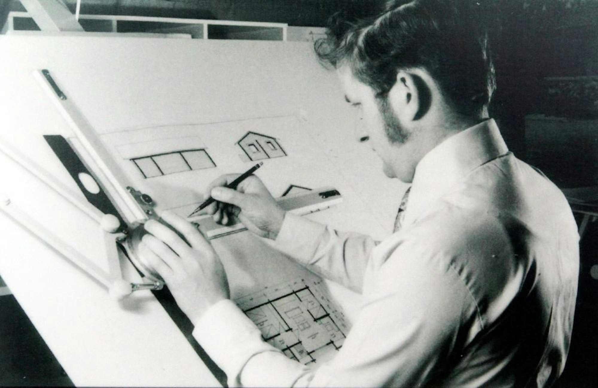 Franz Stommel beim Anfertigen des ersten Entwurfs für ein Blockhaus, das Foto entstand im Jahr 1971.