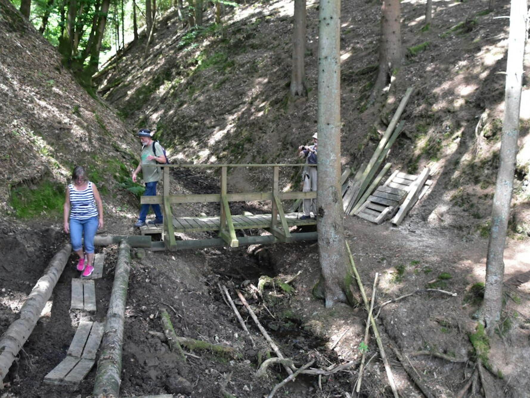 Weiter geht es nach oben zum Campingplatz. Wieder im Tal zweigt der Natursteig nach rechts auf den Steilhang südlich der Sieg ab. Dort erwartet den Wanderer ein besonders anspruchsvoller Abschnitt. „Gefährlicher Waldweg“ warnt ein Schild. Weiter geht der Natursteig über schmale Pfade, links steil ab zur Sieg, rechts steil hinauf. Zeitweise geben die Bäume den Blick auf den Siegtaldom frei. Ein Besuch dort lohnt sich.
