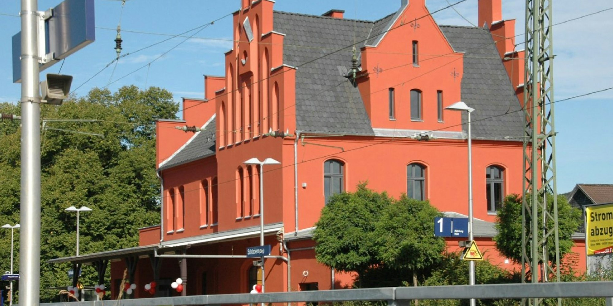 Der alte Schladerner Bahnhof leuchtet frisch renoviert rot in der Sonne.