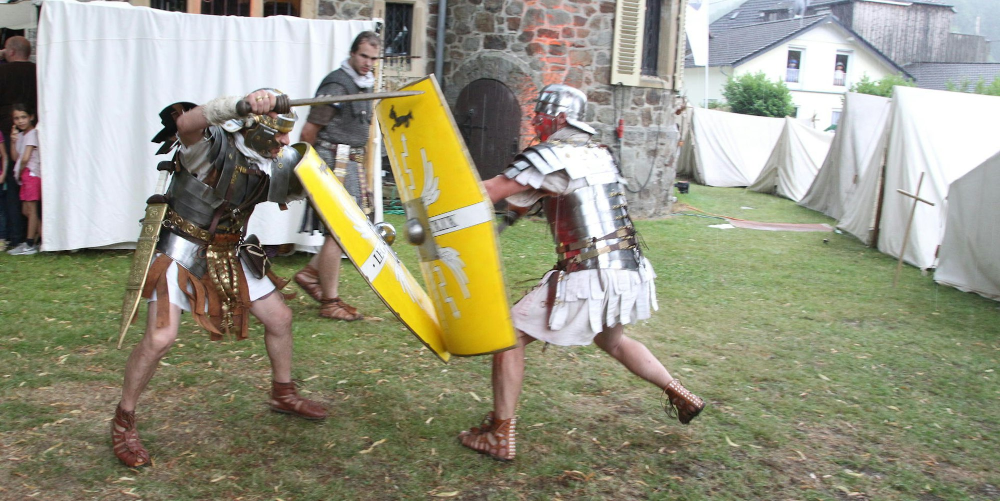 „Die Holzschwerter sind authentisch“, sagte Centurio Quintus Varius. „Im Training wurden nie Blankwaffen benutzt, schon kleinste Verletzungen hätten eine schlimme Entzündung nach sich ziehen können.“