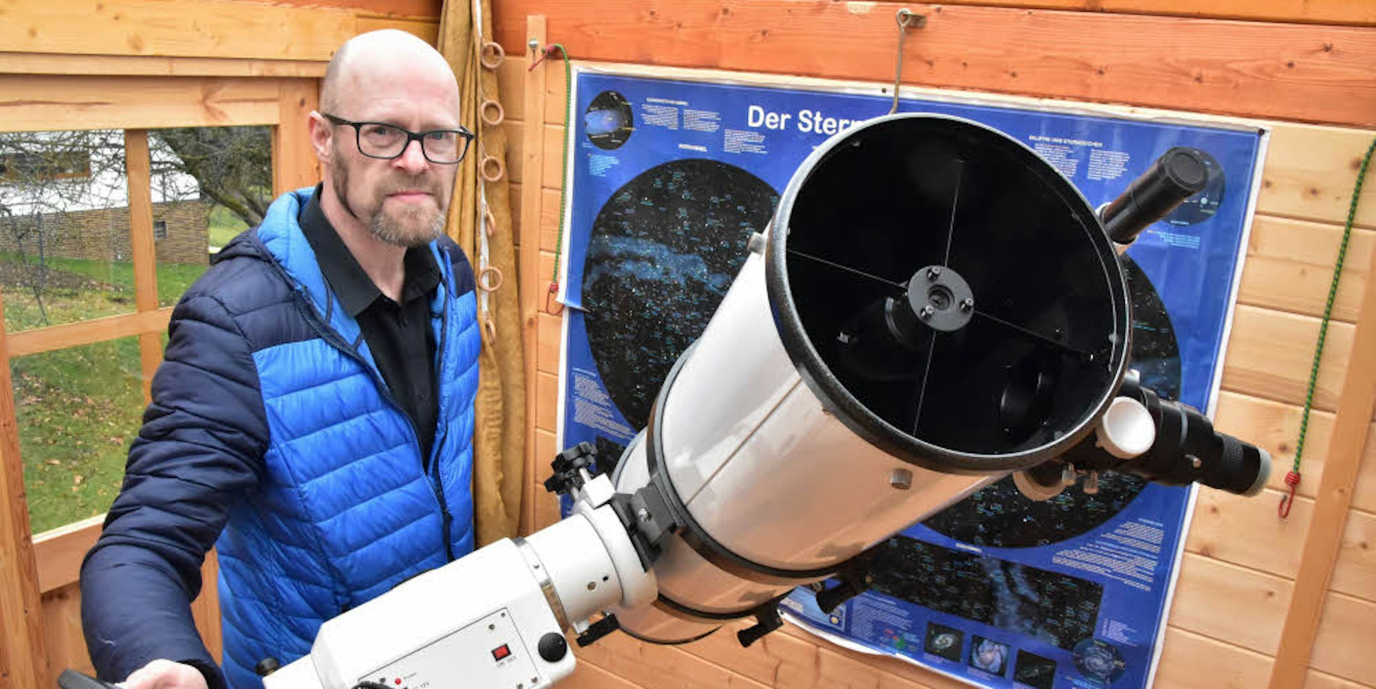 Eitorf – Wenn es Nacht wird über der Oberen Sieg, dann wächst bei dem Mühleiper Frank Bohlscheid die Sehnsucht nach den Sternen. Sofern es der Terminkalender zulässt, zieht er sich zurück in sein Gartenhäuschen, schiebt das Dach zur Seite und richtet sein Dobson-Teleskop auf die Sterne aus.