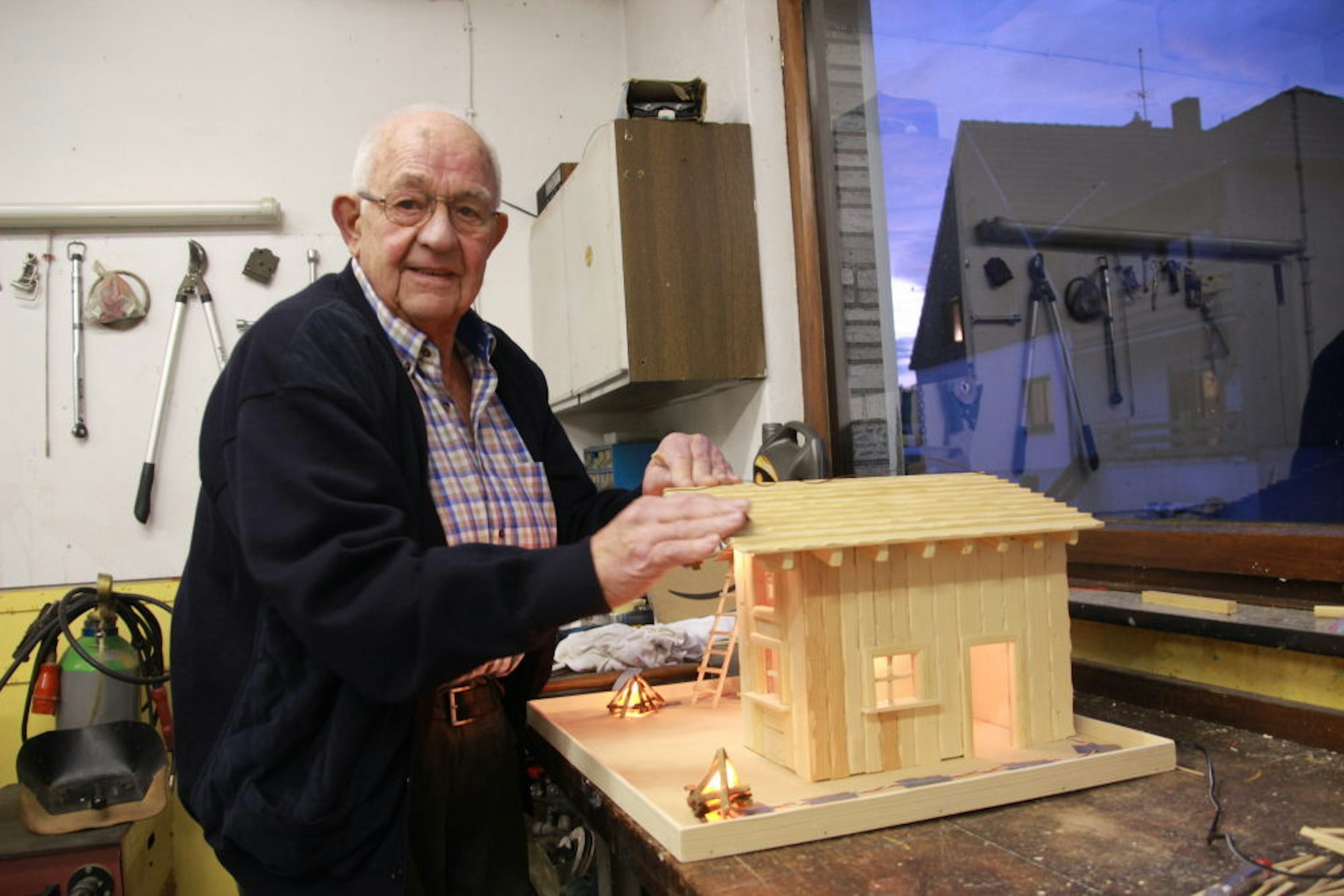Seit dem Sommer baut er eine Krippe für die dritte Enkelin Christin und ihre erste eigene Wohnung. Ein zweistöckiges Holzhaus mit Sprossenfenstern und Leiter. Mit Schleifpapier glättet er das Dach, „da kommt noch Farbe drauf, Stroh fehlt auch noch“. Auch für die beiden Enkelsöhne will der 86-Jährige Krippen bauen, wenn sie einmal von zu Hause ausziehen. „Jungs sind ja später dran...“