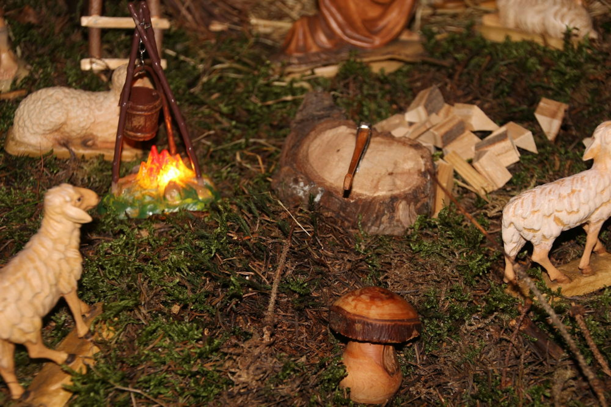 Krippenbau ist die Leidenschaft des Schreinermeisters im Ruhestand, detailgenau fertigt er den Stall, verbindet Fachwerkgebälk, schnitzt Balkongeländer und Fenstersprossen, deckt das Dach mit kleinen Holzschindeln, bastelt Miniaturleitern. Lagerfeuer stellt er her, kleine Pyramiden aus Hölzern und Pergamentpapier, die er über Glühbirnchen stülpt. Er baut Zäune, die jedes Jahr ein wenig weiter um die Krippe gespannt werden, „sie wächst ja weiter“.