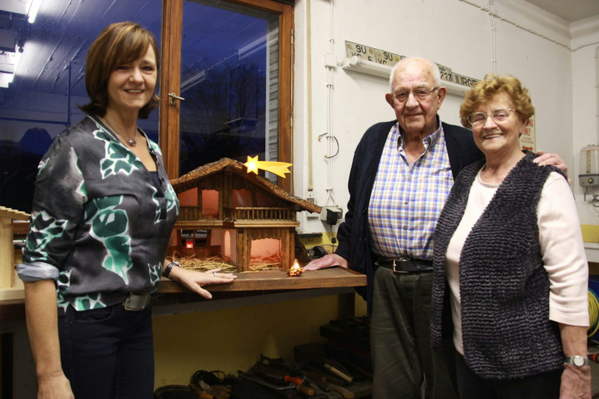 Tochter Sabine Pfister „übersommerte“ ihre vom Vater gebaute Krippe in der Werkstatt bei den Eltern Robert und Katharina Prinz.