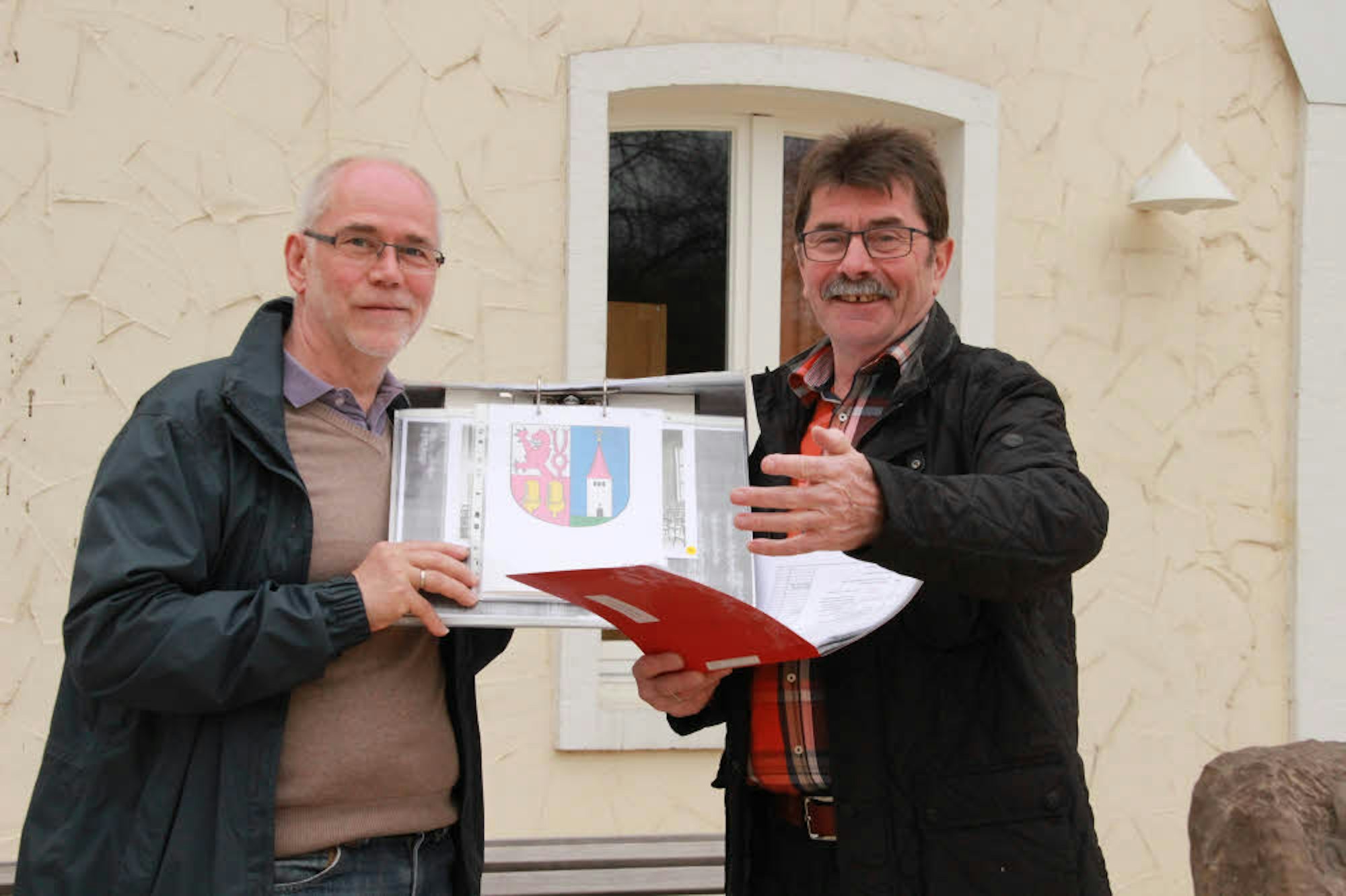 Die Unterlagen immer parat: Norbert Herkenrath und Bernd Winkels (r.) führen durch das historische Eitorf.