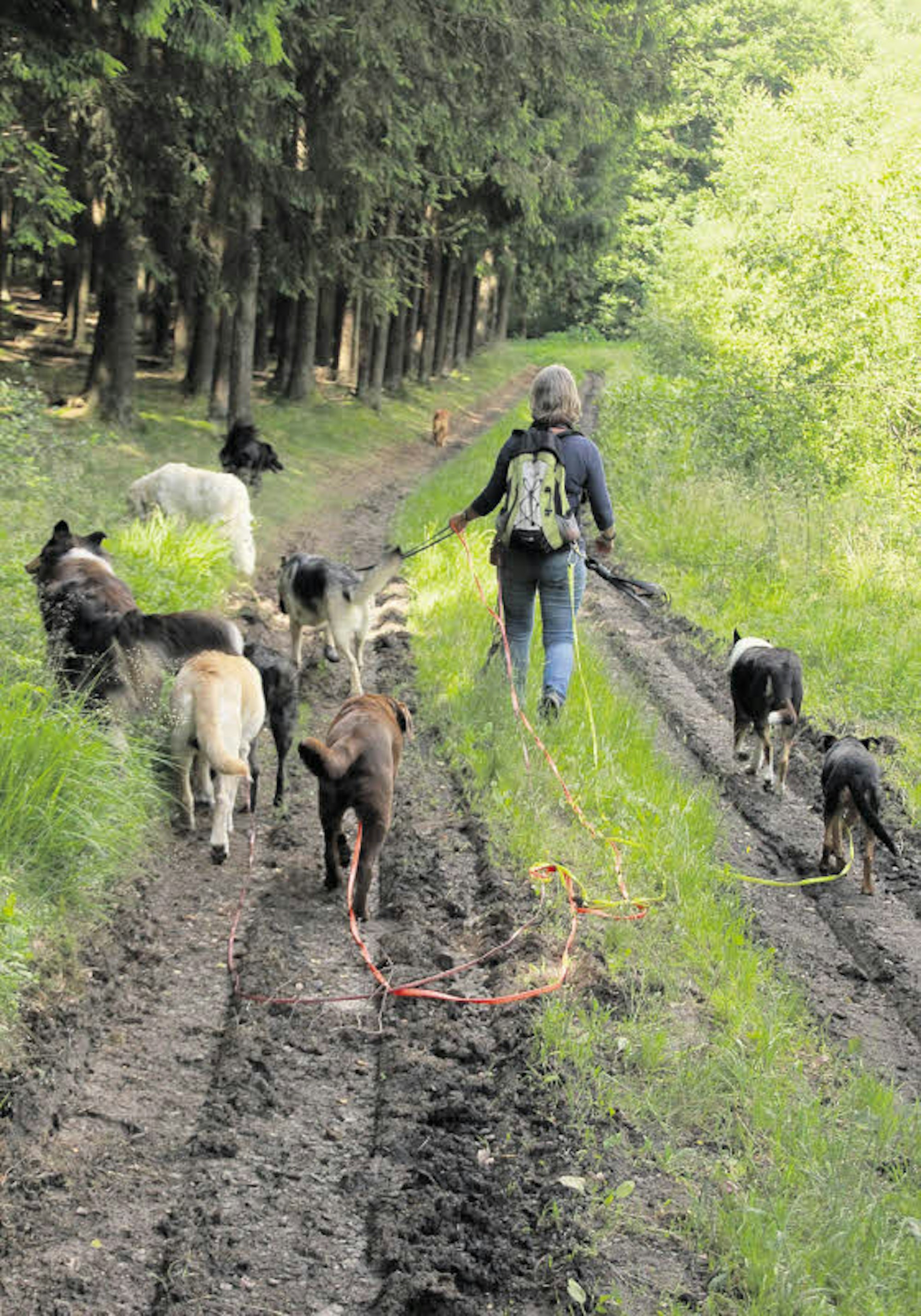 25 Hunde in unterschiedlichen Konstellationen führt sie auf diese Weise aus, geht mit bis zu zwölf Tieren auf einmal – im Wald ebenso wie in der Stadt. Autos, Wildwechsel – kein Problem. Kein Hund flitzt einfach auf die Straße oder verfolgt eine Fährte und verschwindet auf Nimmerwiedersehen im Wald. Nicht einmal Golden Retriever Jale, der in seinem kriminellen Vorleben mal ein Reh gerissen hat.