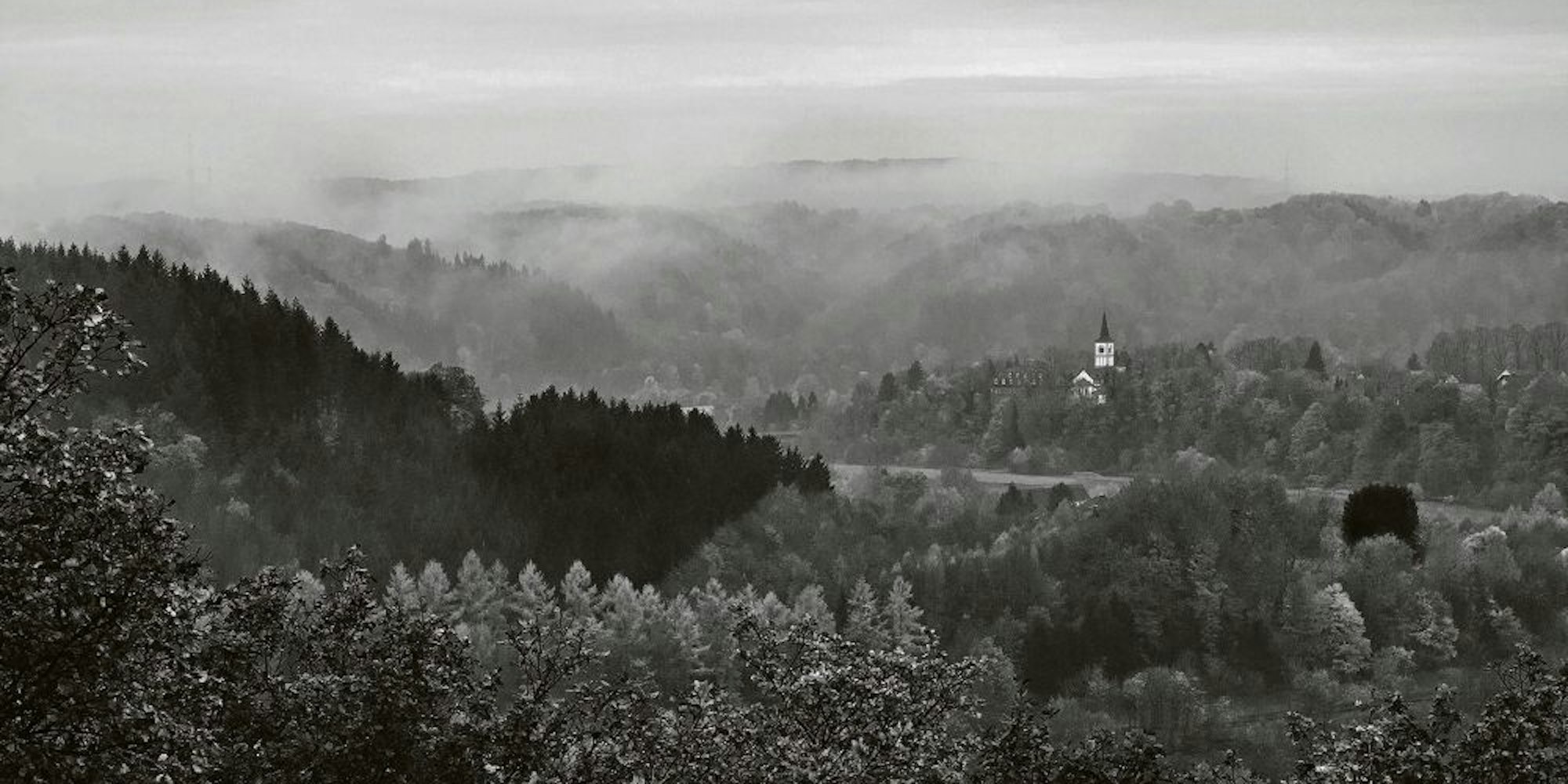 Blick auf Merten umgeben von Wald und Nebel, eine Aufnahme aus der Reihe Stille.
