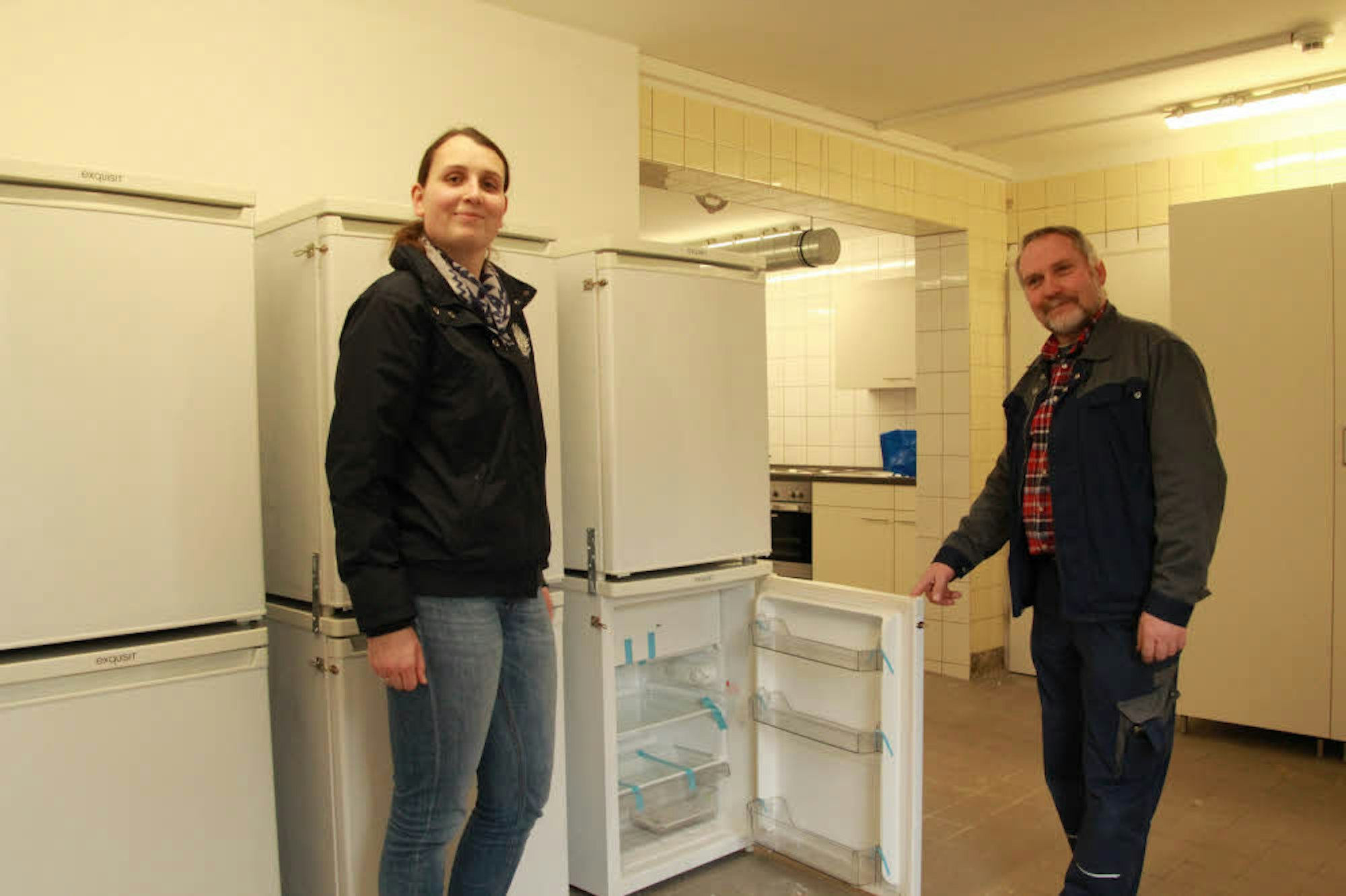 Michaela Lehmacher und Hans Peter Schmitz zeigen in der neu ausgestatteten Gemeinschaftsküche einen von zehn neuen Kühlschränken.