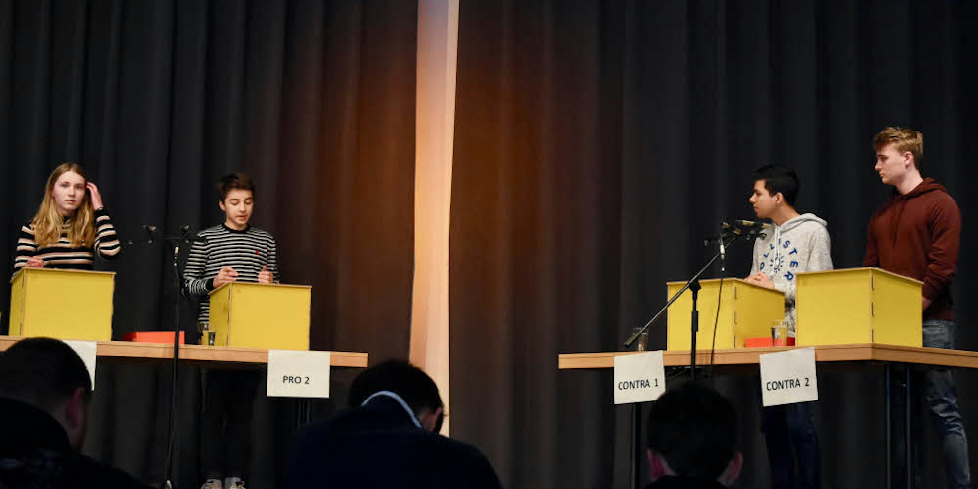Jeweils zwei Teilnehmer vertraten das Für und Wider eines Themas. Bei der Debatte in der Altersgruppe II konnte sich Julian Ackermann (2. v. l .) durchsetzen.