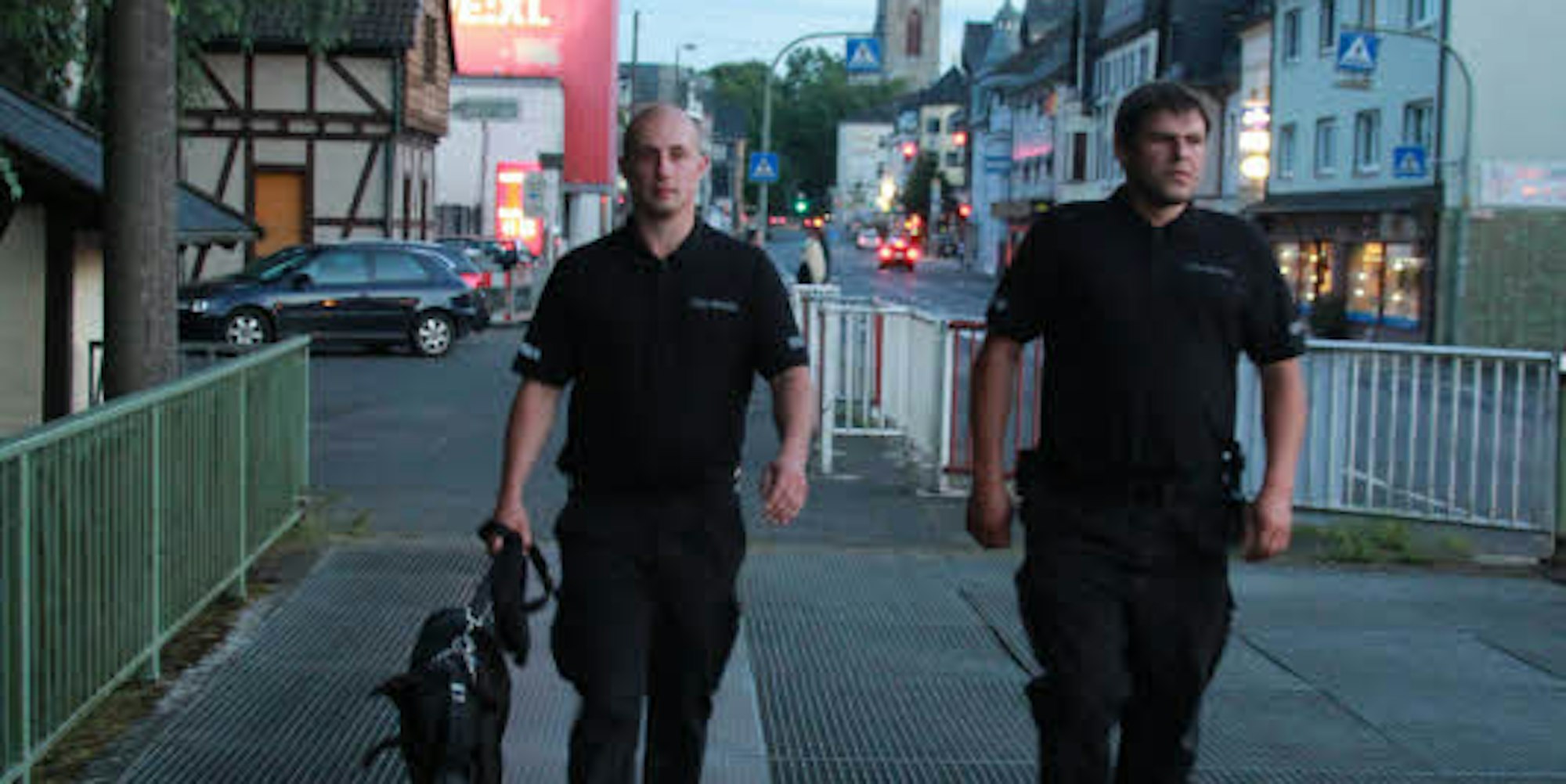 Die Eitorfer City-Streife auf Patrouille: Fabian Faber mit Dobermann Tony und Julian Zlopasa überprüfen im Auftrag der Verwaltung Schulgelände und Grundstücke, die der Gemeinde gehören.