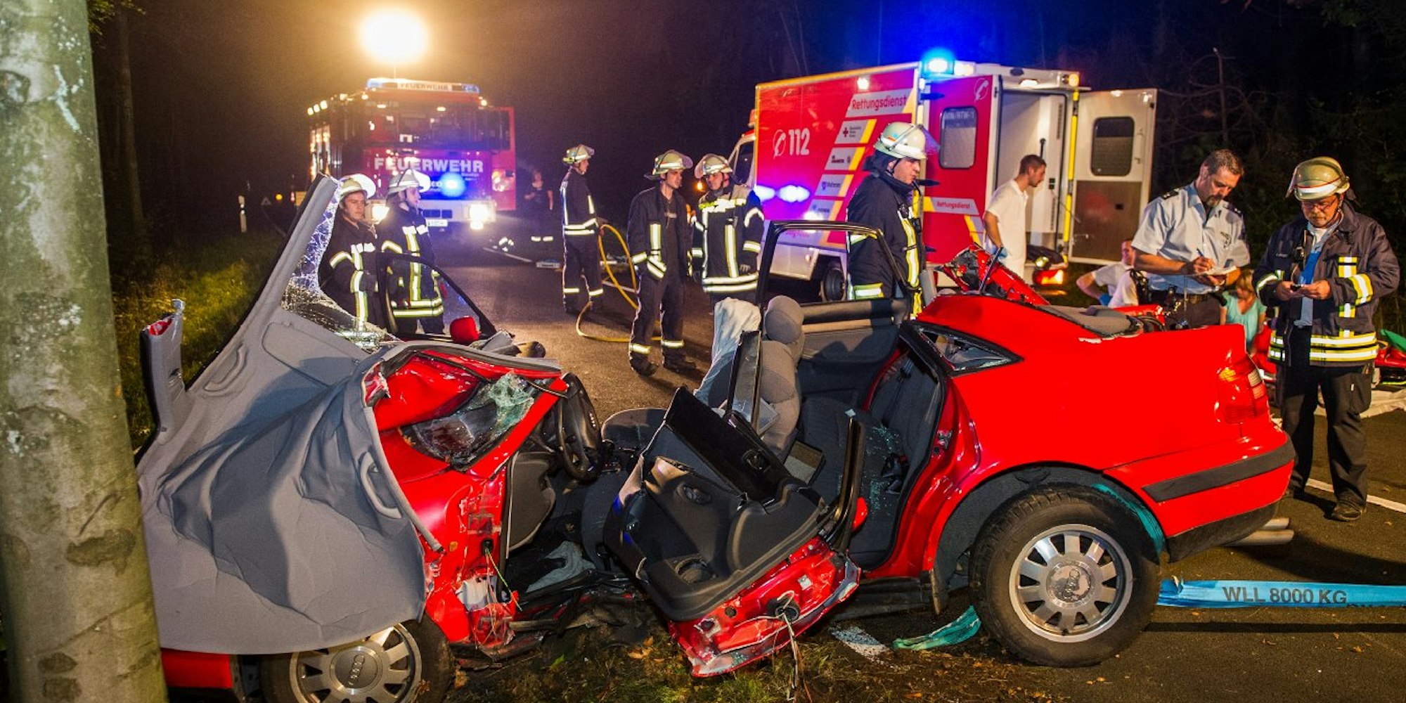 Die Wucht des Aufpralls war so stark, dass sich das Fahrzeug in Höhe der Fahrzeugmitte um den massive Stamm wickelte. Das machte die Rettungsmaßnahmen der 45 Feuerwehrleute aus den Löschzügen Rosbach, Dattenfeld und Leuscheid schwierig: In Absprache mit einem Notarzt und Rettungssanitätern mussten sie das Wrack Stück für Stück mit einem Seilzug und schwerem hydraulischen Gerät auseinanderziehen und -schneiden, um den eingeklemmten Mann zu befreien.