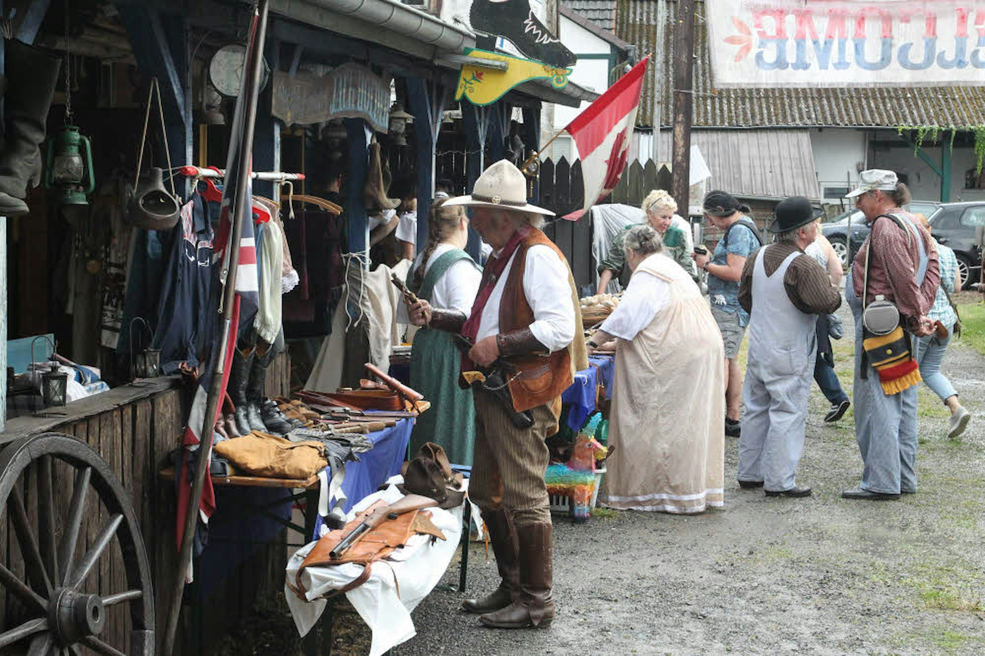 An Händlerständen werden Waffen, Felle, Lederwaren und andere Utensilien für das Leben im Wilden Westen feilgeboten.