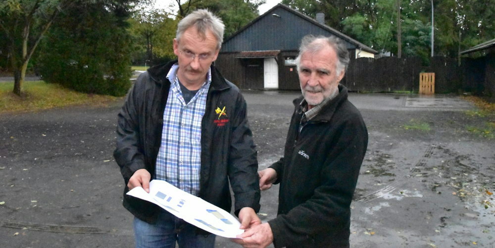 Andreas Gelhausen (l. ), Vorsitzender Hobbybühne Hurst, und Siegfried Röck, Vorsitzender des Männergesangvereins, mit dem Plan.
