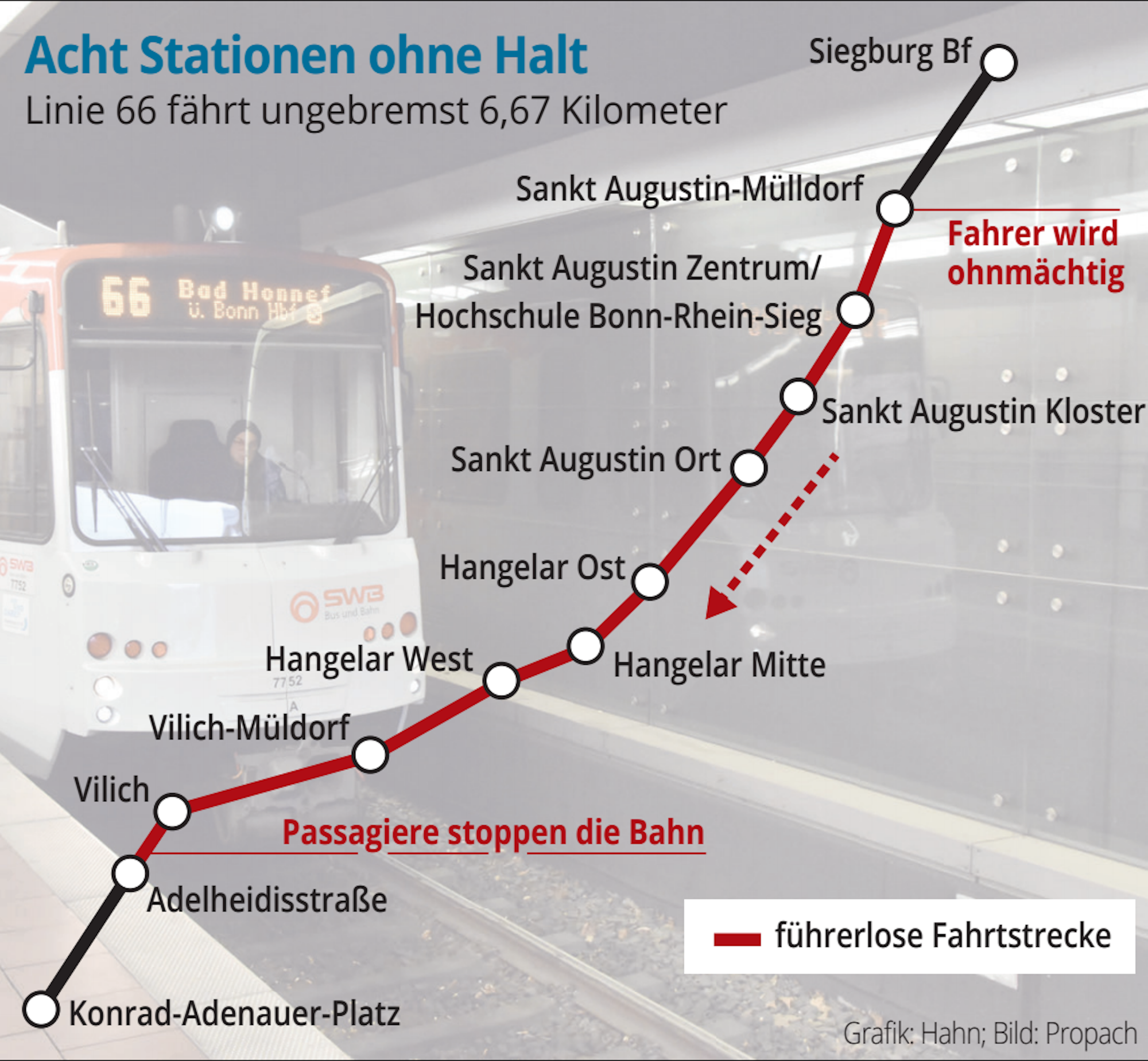 Erst als zwei Passagiere, 29 und 26 Jahre alt, die Fahrerkabine aufgebrochen hatten, konnten sie unter telefonischer Anleitung der SWB-Leitstelle den Zug kurz vor der Haltestelle Adelheidisstraße in Beuel stoppen. Niemand der 20 Fahrgäste wurde verletzt. Der Fahrer hatte drei Monate vor der Unglücksfahrt seine praktische Prüfung abgelegt.