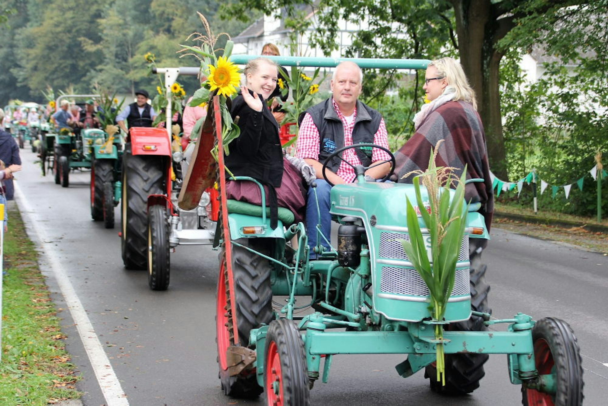 Durch das BröltalFarbenfroh mit Feldfrüchten, Blumen und Gräsern geschmückte Erntefahrzeuge, in der Schubkarre eine viel bestaunte Erntekrone. Der Erntezug des Bröltaler Erntevereins gehört zu den schönsten seiner Art in der Region. Eingebettet in das große, dreitägige Erntefest rollten die Wagen über die Straßen in Bruchhausen-Röttgen, Fußgruppen und der Musikverein Heddinghausen komplettierten die fröhliche Atmosphäre.