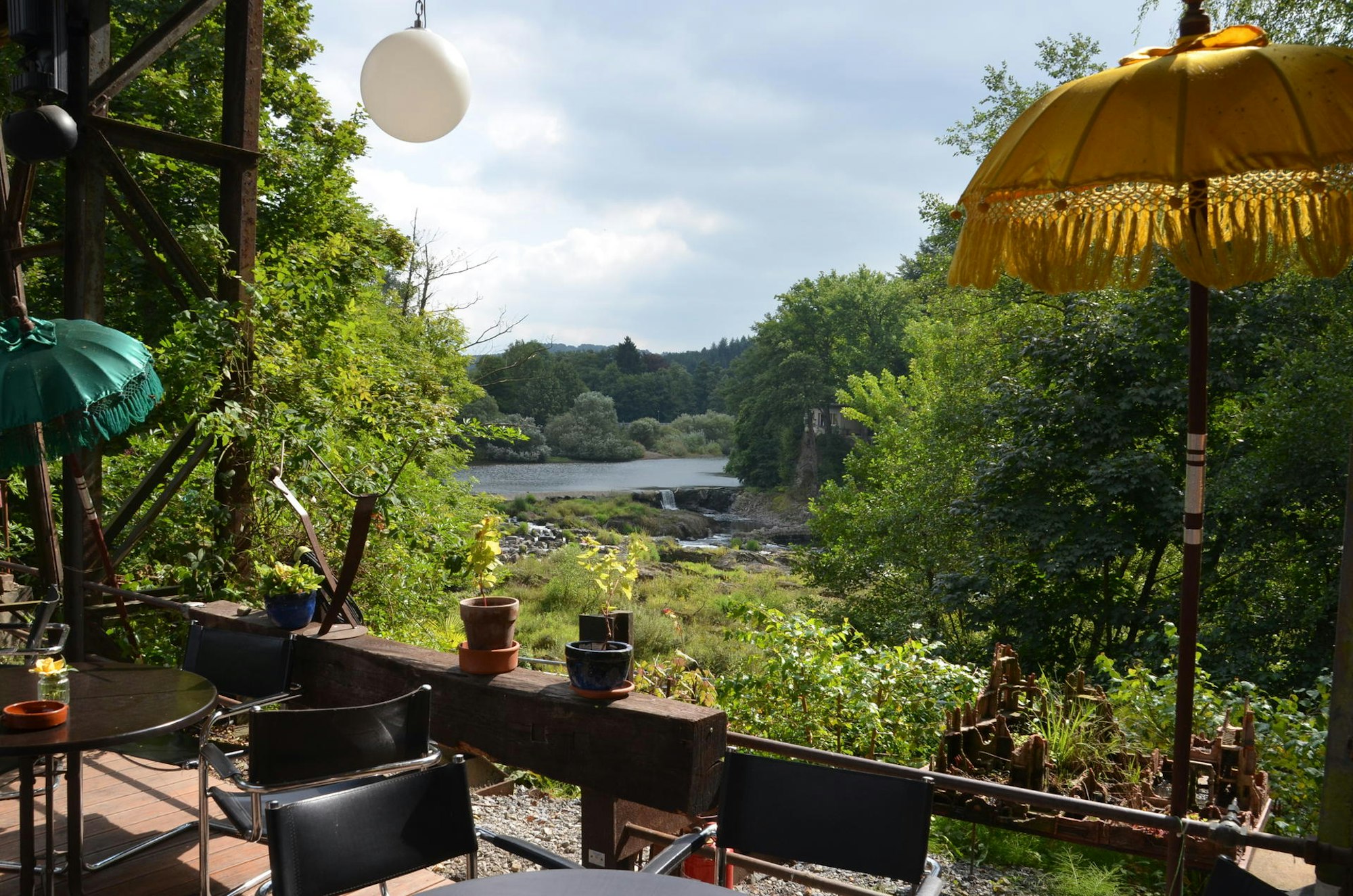 Zurück nach Schladern führt ein Pfad, den schon die Arbeiter nahmen, wenn sie frühmorgens zum Werk der englischen Firma Elmore zur Schicht gingen. Die Firma hatte ihren Sitz unmittelbar am Wasserfall, der beim Bau der Bahn künstlich entstand. In einem Teil der ehemaligen Fabrik sind heute die Kulturhalle Kabelmetal und der Elmores Biergarten untergebracht. Dort lohnt sich der Besuch und das Verweilen bei einem guten Eis, das es im Übrigen auch an der Hauptstraße gibt.