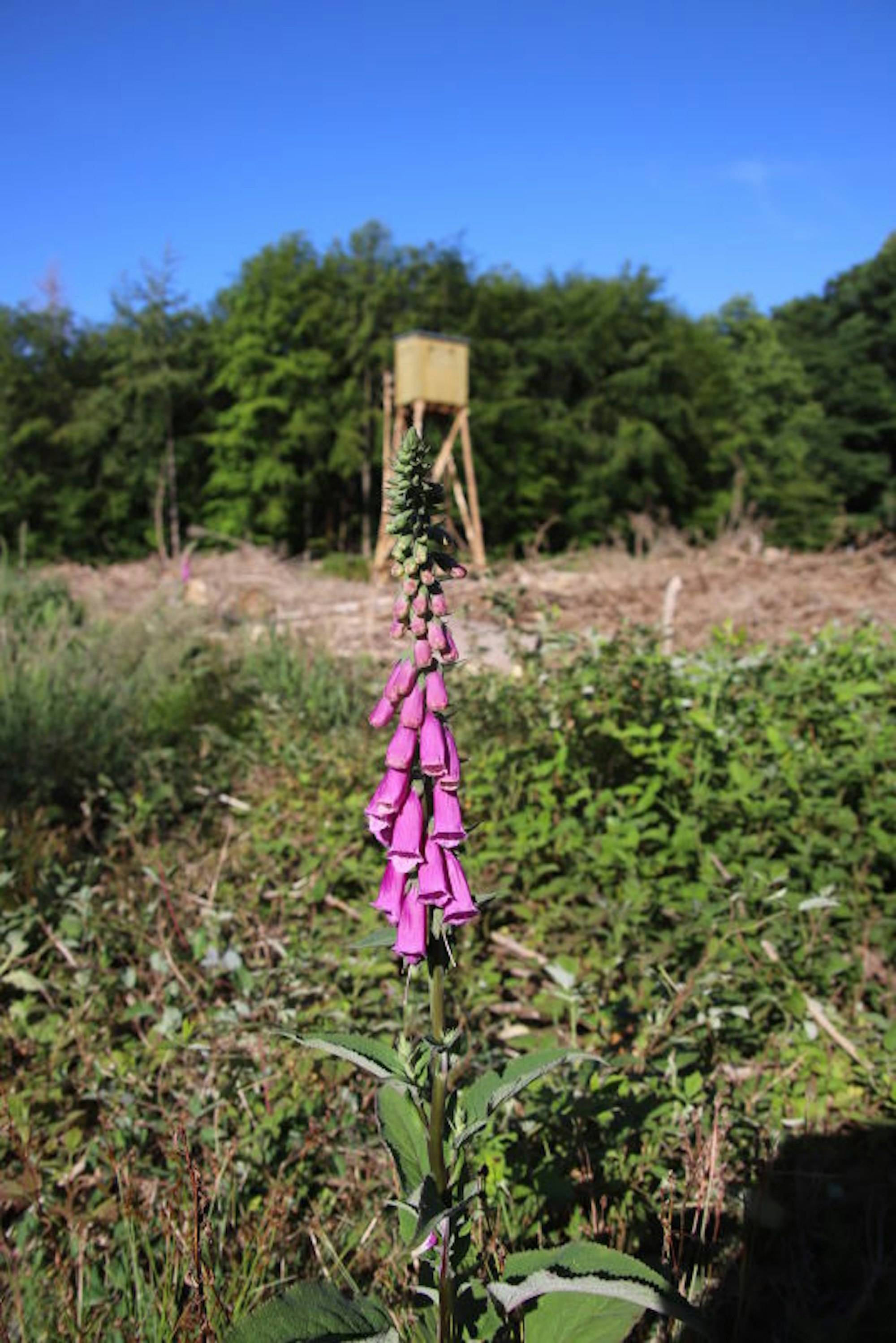 Über den heimischen Fingerhut geht der Blick in das Biotop mit dem alten Buchenbestand am Ingerberg.