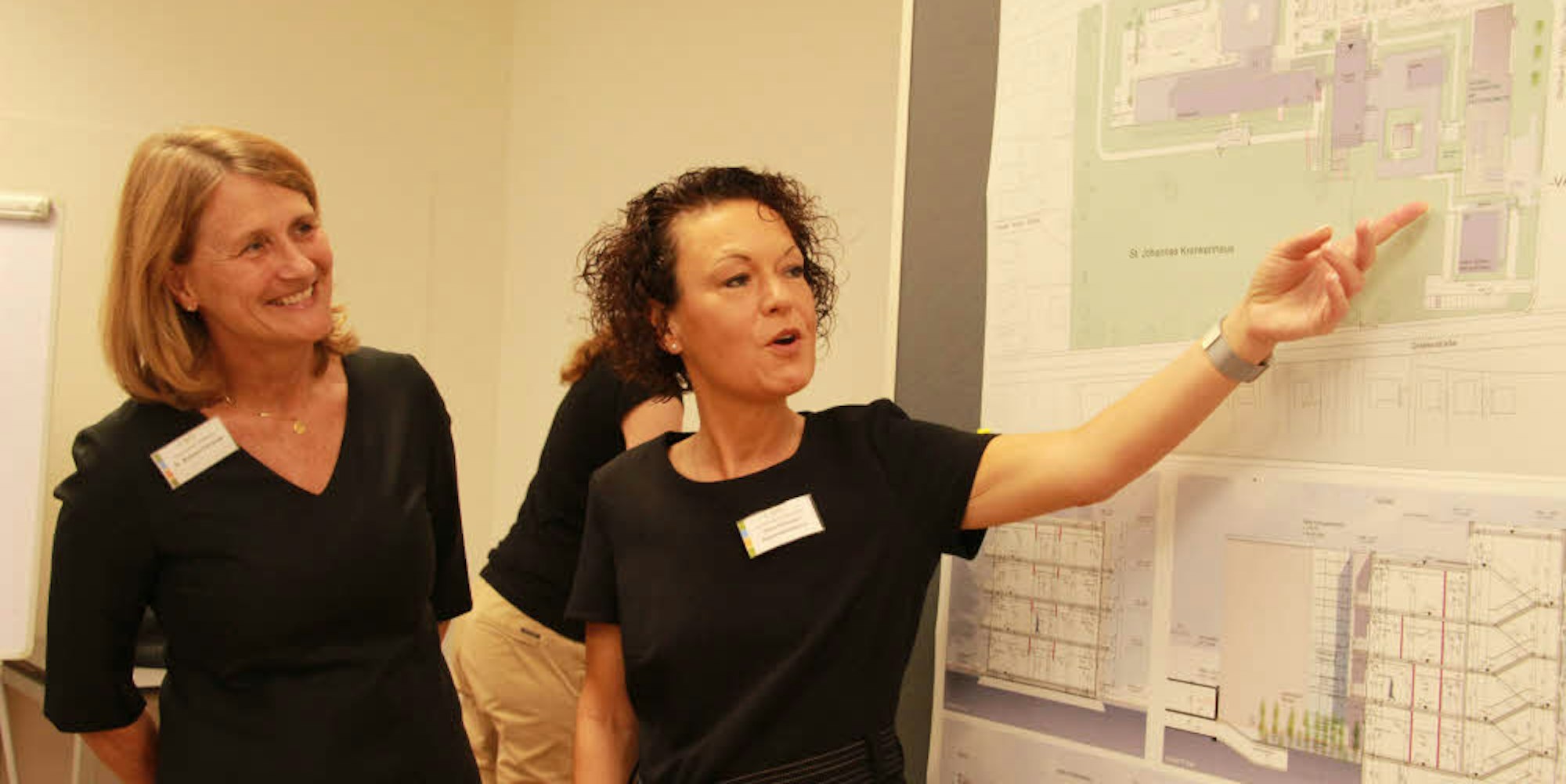 Dr. Barbara Florange und Petra Hohmann zeigen den Standort für das neue Klinik-Gebäude.
