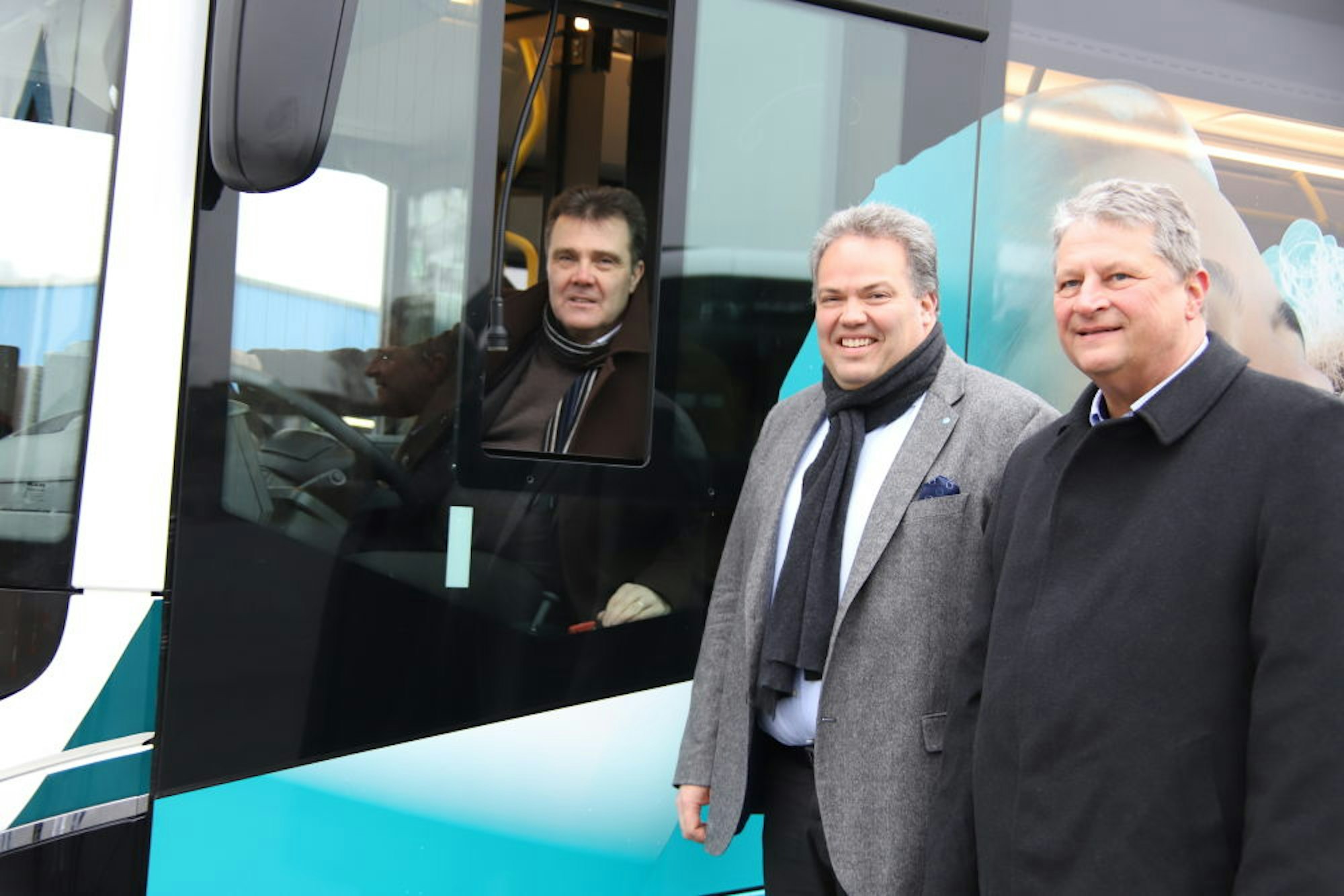Die beiden RSVG-Geschäftsführer Volker Otto (l.) und Michael Reinhardt (r.) sowie der Aufsichtsratsvorsitzende Marcus Kitz stellten die Flotte vor.