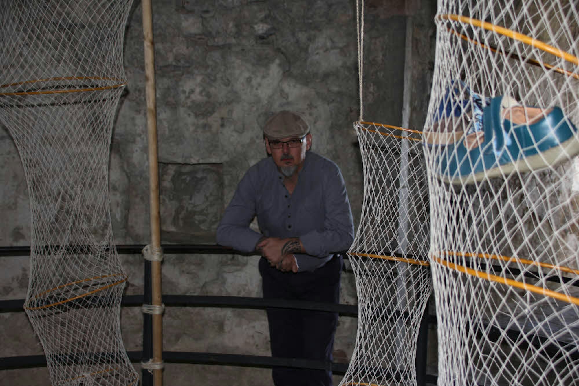 Kulturamtsleiter Dominique Müller-Grote steht im Turm, in dem Martina Clasen Fischernetze auch mit Schuhen von Flüchtlingen gehängt hat. Den Weg zum Turm bewacht der Ritter von Roland Krämer.