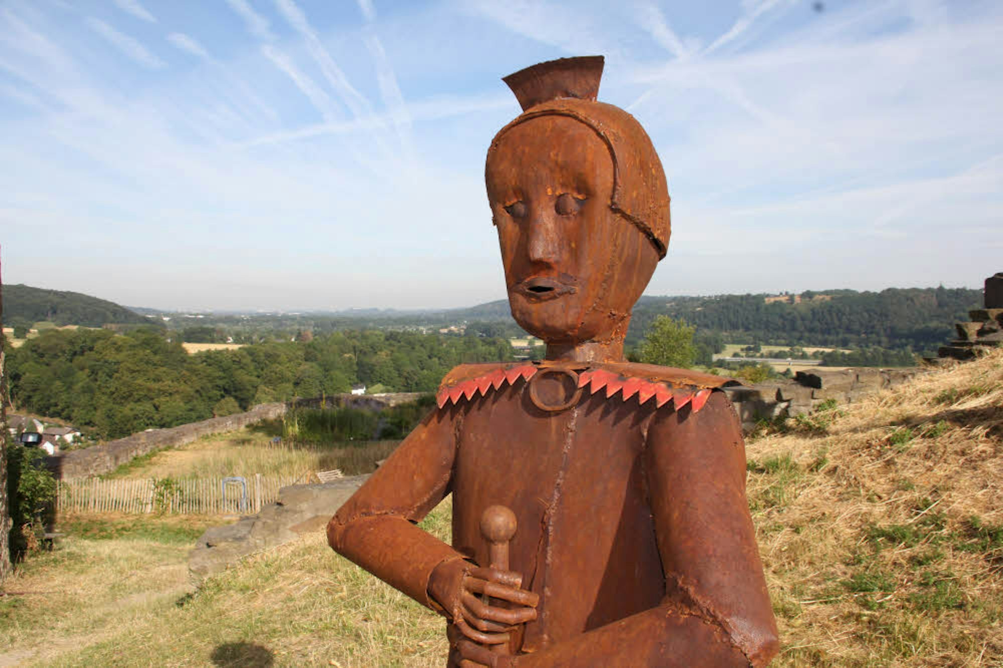Unterhalb des Bergfrieds stürmt eine metallene Hundemeute auf einen Knochen zu. Angelika Strobach hat ein einzelnes Tier den anderen gegenüber gestellt. Die Hunde, so sagt die Künstlerin, schauen auf die Kunst, in diesem Fall auf der Burg, von intellektuell bis uninteressiert. Eine spezifische Auseinandersetzung mit der Ausstellung.