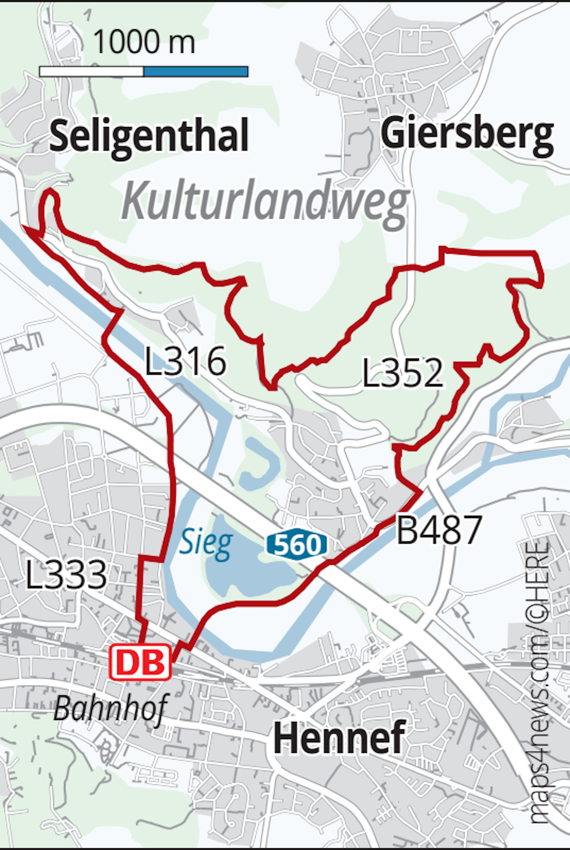 Die rund zehn Kilometer lange Runde verbindet Stadt, Land und Fluss aufs Feinste. Start ist am Bahnhof in Hennef. Dort findet sich auch die erste Station des Waagenwanderwegs, der den Wanderer durch die Stadt geleitet. Immerhin wurde 1883 hier die erste automatische, eichfähige Waage der Welt erfunden.