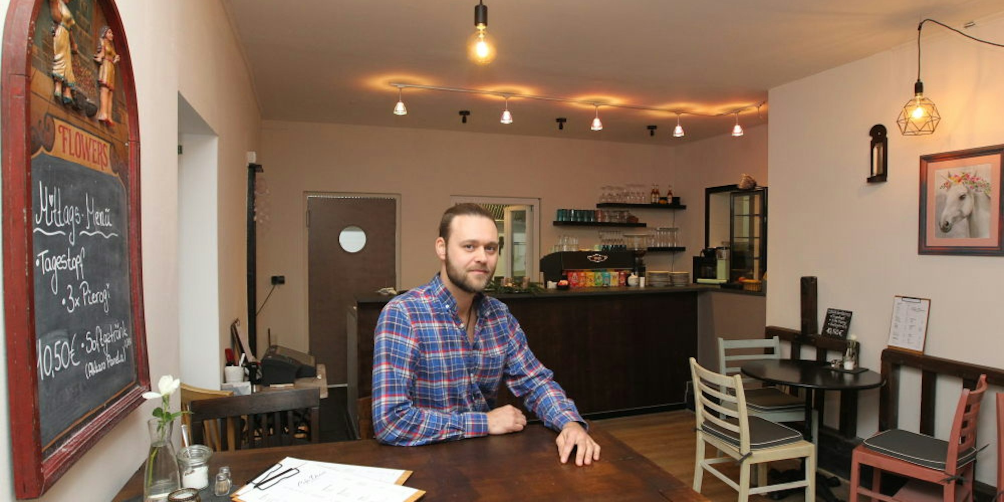 „Wir haben alles selbst gemacht“, erzählt der 34-Jährige mit Blick auf das Interieur, das schick und zugleich gemütlich wirkt. Bei den in Pastelltönen gestrichenen Stühlen an den Bistrotischen handelt es sich um alte Chorstühle, wie hier und da eine Notenablage noch erkennen lässt. Sie standen ehedem in einer Kirche.