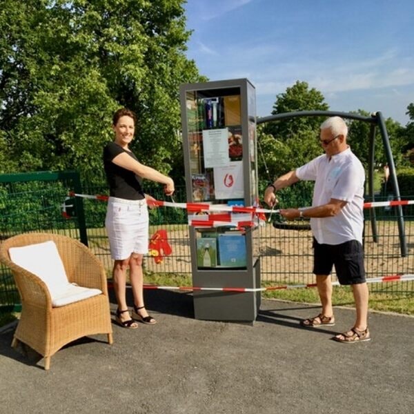 Der Baubetriebshof pflasterte die Fläche. Diese soll erweitert werden, zudem wird ein Bordstein abgesenkt, um Rollstuhlfahrern den Zugang zu ermöglichen. „Bücherschränke sind schöne, kleine Bildungsprojekte“, sagte Dahm, „sie sind ein jederzeit verfügbares, niederschwelliges Bildungsangebot für alle – mitten im Ort und rund um die Uhr geöffnet.“