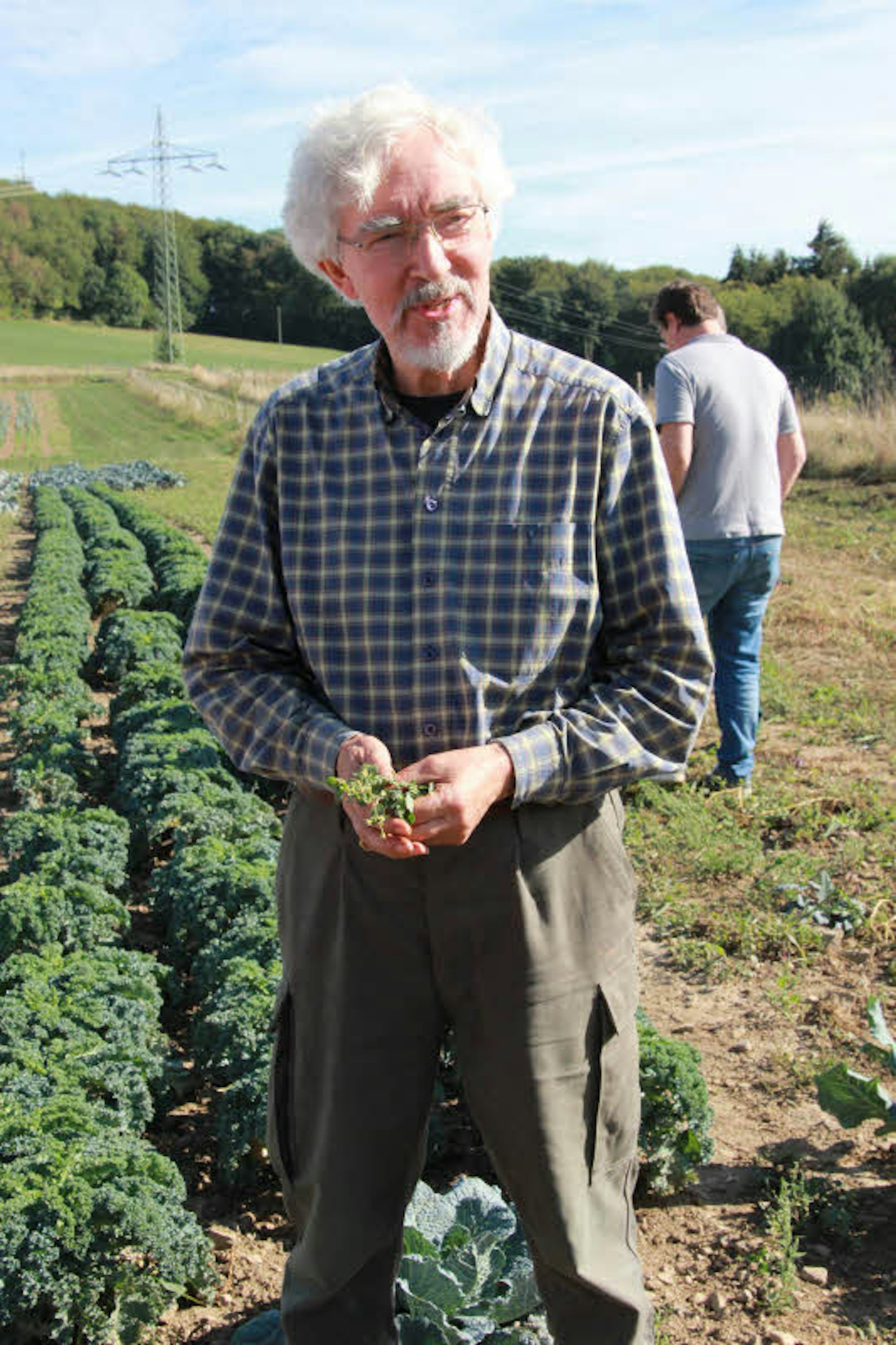 „Die Solawi ist ein ganz wichtiges Wirtschaftsmodell“, findet Biologe Rudolf Rabe, der gerade erst aus Essen hergezogen ist. Er will sich über das Hofgemüse informieren und selbst Tipps geben, wie man den Speiseplan leicht mit Wildkräutern aufpeppen kann. „Im Salat sind so gut wie keine Vitamine. Wildpflanzen sind da eine ideale Nahrungsergänzung, diese Pflanzen haben ja noch alle Kräfte und können den Menschen unterstützen.“ Franzosenkraut und Melde hat er auf dem Weg zum Feld abgezupft und zeigt die Stängel, die zart-aromatisch (das erste Kraut) und herzhaft-nussig (das zweite) schmecken sollen.