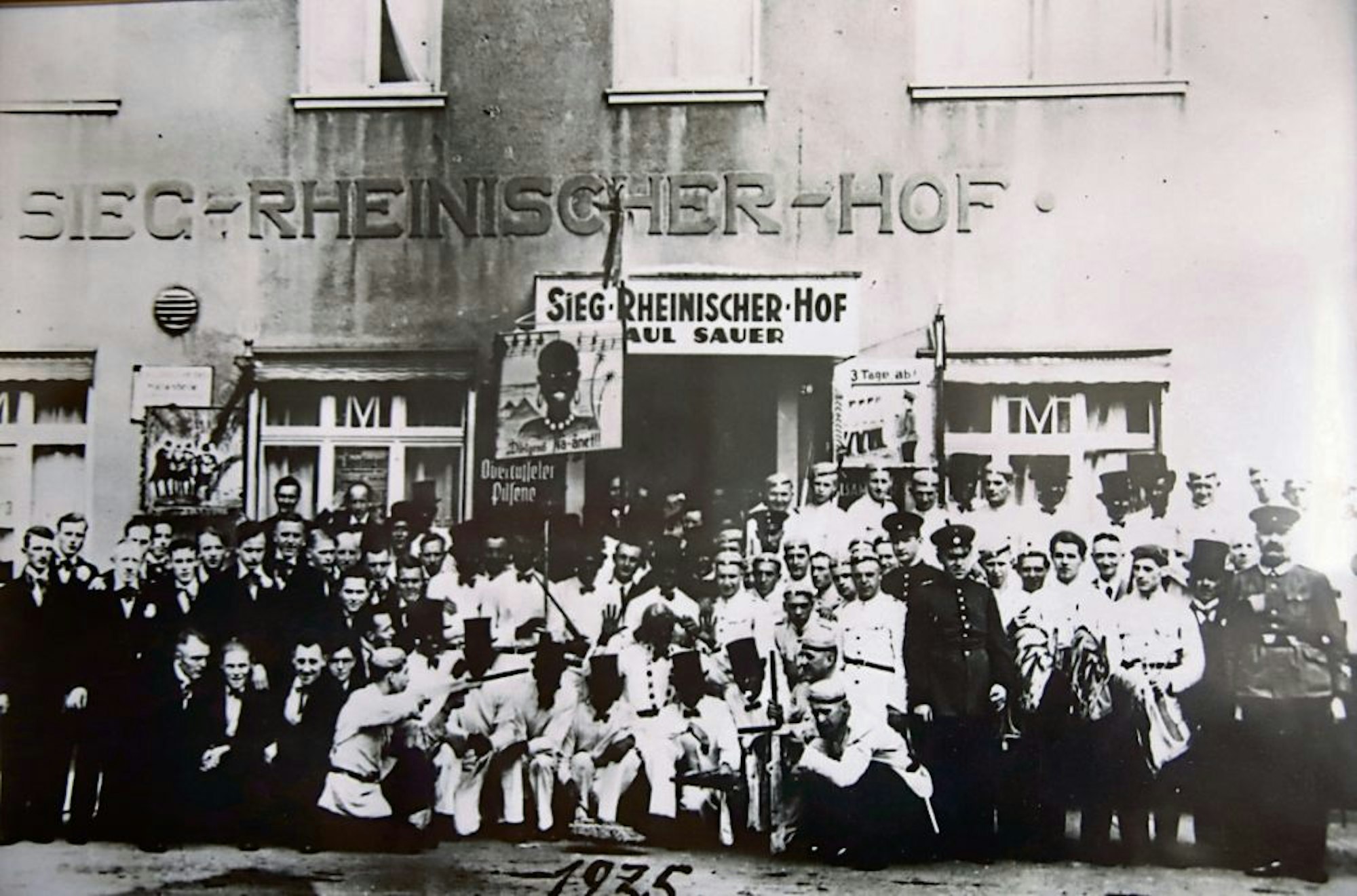 Der „Sieg-Rheinische Hof“ ist auf mehreren Aufnahmen zu sehen, mal mit dem Männergesangverein Geistingen, mal zu Karnevalszeiten. Es ist die alte Gaststätte, noch vor Zeiten des Kreisverkehrs und der Theodor-Heuss-Allee.