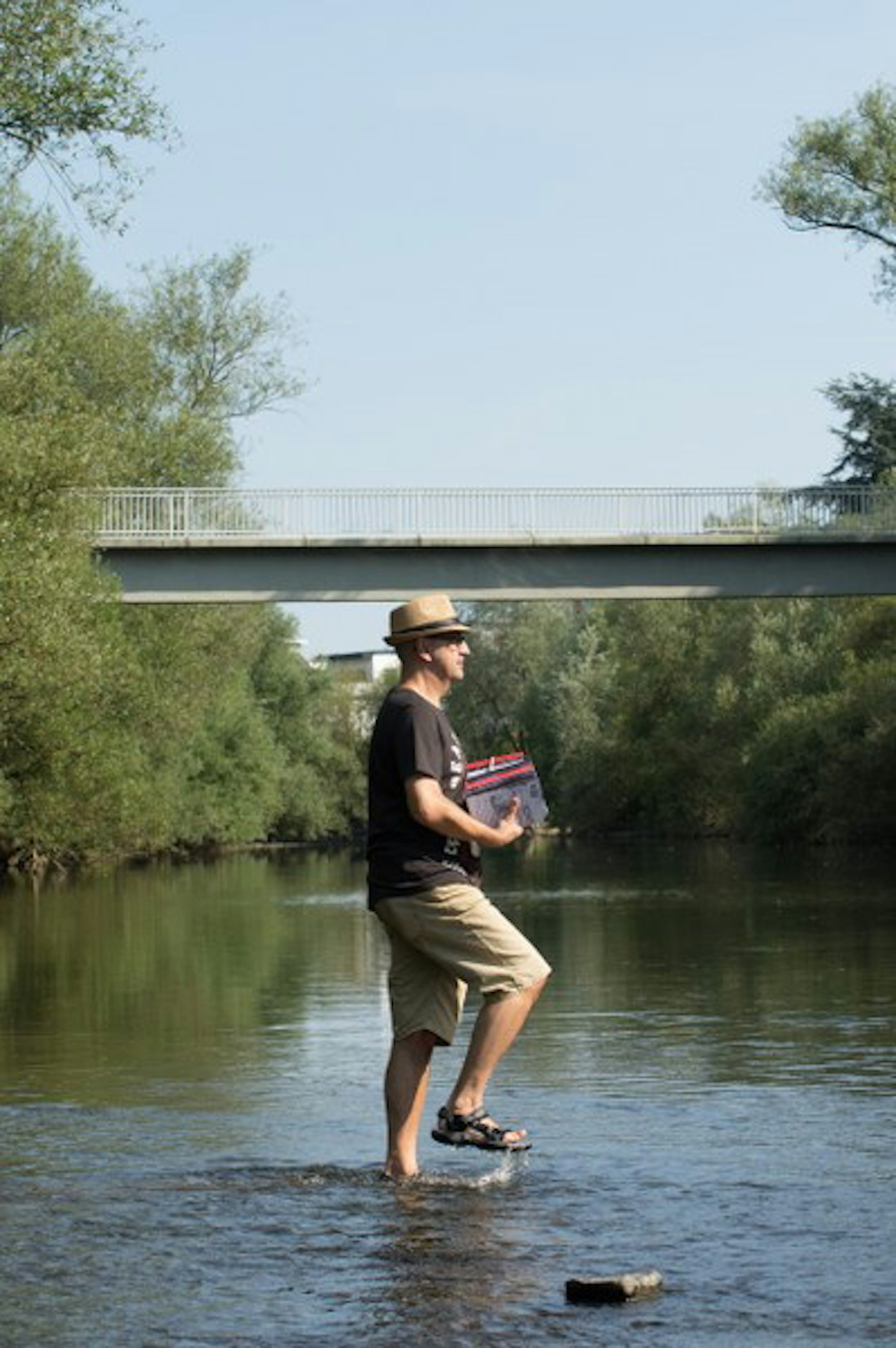 Auch Michael Wagner ließ sich darauf ein. Mit einem Stapel Bücher auf dem Arm marschierte der Krimiautor und Künstler von Hennef durch den Fluss nach Allner. Wagner hat weitere Ideen, will Impulse setzen und betrachtet die Aktion mit der gebotenen Ernsthaftigkeit, aber auch mit Humor. „Hennef hat so viele kreative Köpfe; in Richtung Kunstaktion geht hier noch eine Menge“, zeigt er sich zuversichtlich. So hält er – „mal ins Blaue gesprochen“ – einen Ponton als Zwischenlösung für durchaus denkbar, „statt vier Jahre oder länger auf die neue Brücke zu warten“.