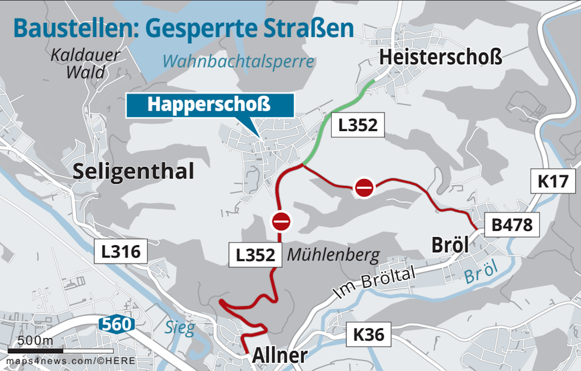 Hennef – Einen rund zehn Kilometer langen Umweg durch das Bröltal müssen die Anwohner in Happerschoß und Heisterschoß seit Montagmorgen in Kauf nehmen: Wegen Sanierungsarbeiten ist die L 352 Richtung Allner sechs Wochen lang gesperrt, ebenso und bereits seit Mitte März, die Happerschoßer Straße Richtung Bröl. Die Dorfbewohner müssen nun über Neunkirchen und Ingersau ausweichen.