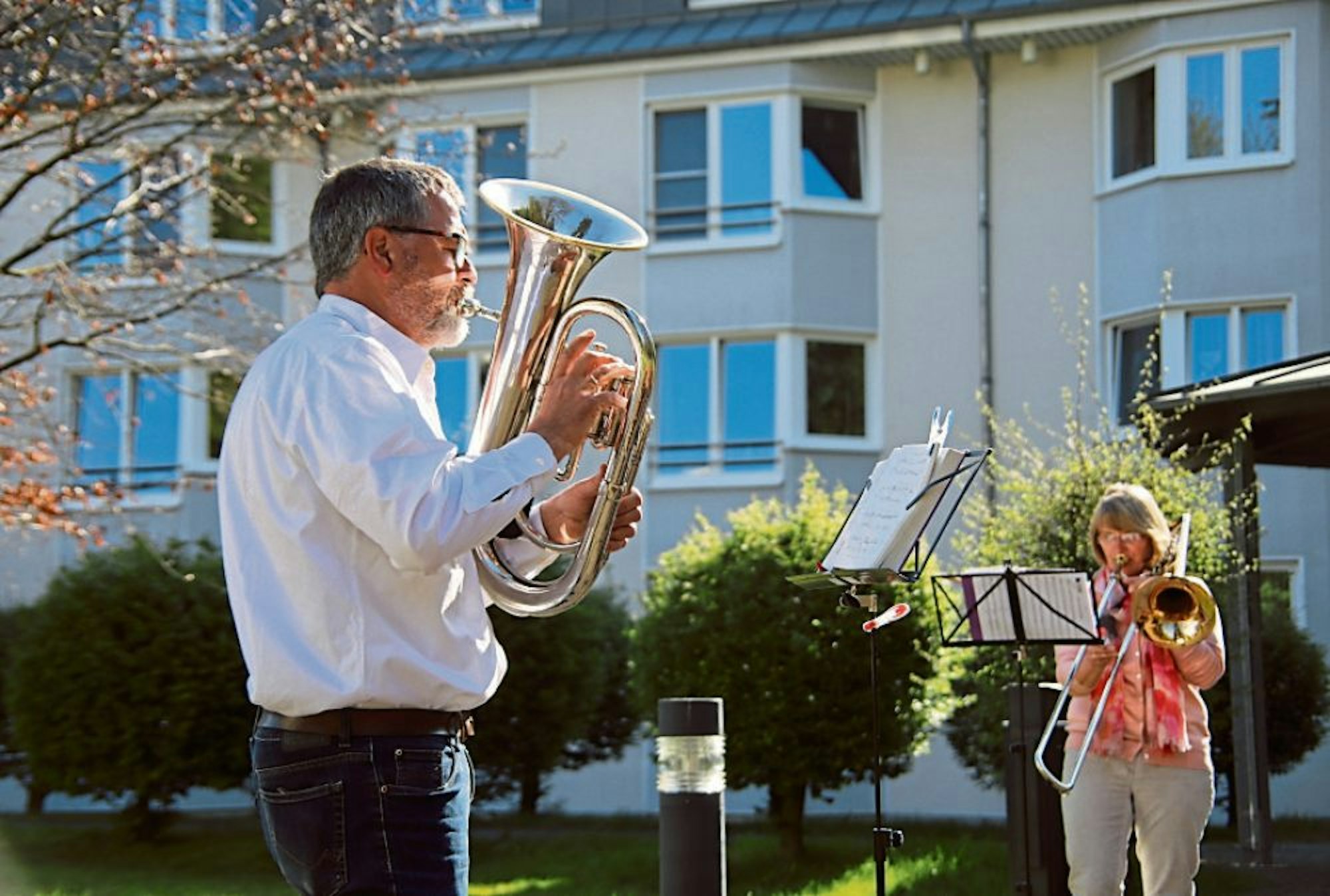 Seit Wochen schon erfreuen sie die Bewohner mit ihrer Musik, so die des Kurhauses. Im Kurpark standen sie mit Posaune, Horn und Trompete, gut hörbar für die älteren Menschen, die es in Zeiten der Corona-Pandemie sicherlich am schwersten haben.