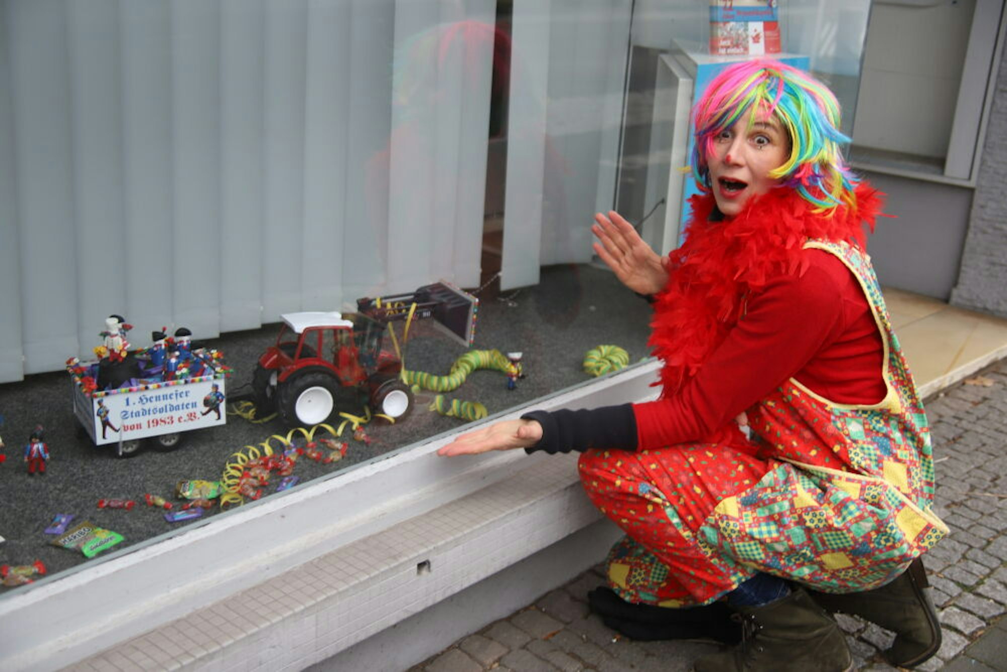„Kamelle!“ In einem Schaufenster an der Frankfurter Straße steht im Miniaturformat der Wagen der 1. Hennefer Stadtsoldaten.