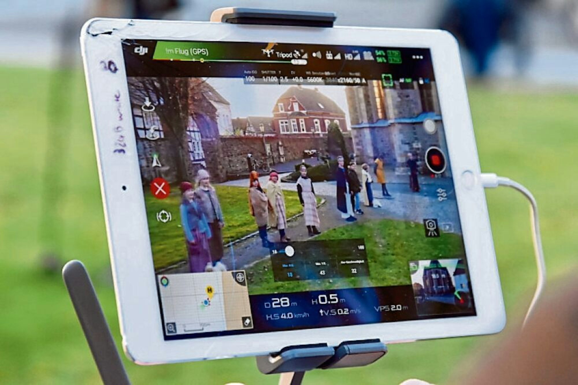 Im Garten der Wallfahrtskirche Bödingen hieß es am Samstag für die Krippenszene zum letzten Mal: „Kamera läuft.“ Zunächst ließen die Macher alle 22 Darstellerinnen und Darsteller für die Aufnahme des Abspanns in Reihe antreten. Für das finale Filmgruppenbild flog eine Drohne an der Protagonisten-Phalanx vorbei und fing die Gesichter ein, denen Glück und Stolz anzusehen war. Und das zu Recht, denn Rönn-Rieck und Müller-Goldkuhle, die sich das Regieamt hinsichtlich der mimischen und filmischen Aspekte teilten, waren „begeistert und erstaunt“ über die Unbefangenheit, Spielfreude und vor allem die Geduld der Kinder während der Dreharbeiten.