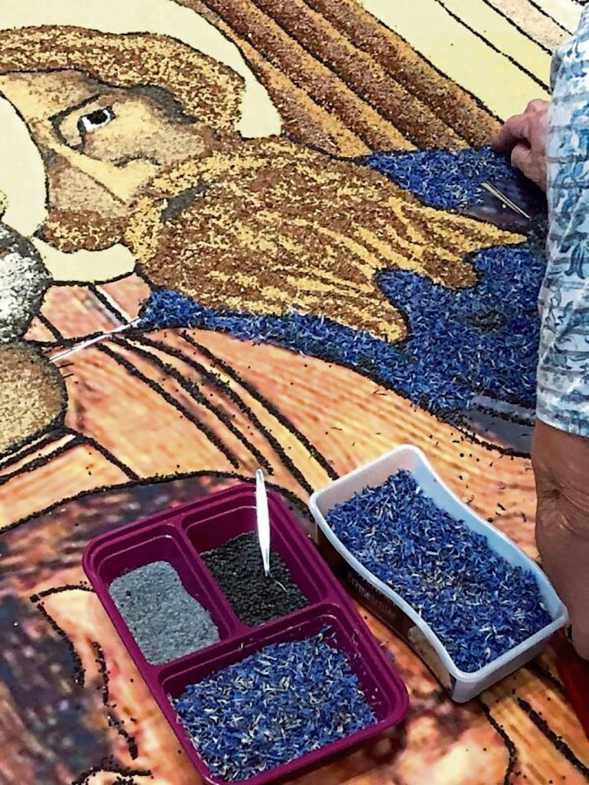 Mit höchster Akkuratesse streuten die Helferinnen und Helfer die Umrisse aus. Reiskörner verschiedener Sorten, andere Getreide wie Hafer und Roggen, Buchweizen, Lavendel, Kornblumen, Schmucklilien-Blüten aus Pfarrer Lahrs Garten, grüne Linsen, Oregano und Thymian kamen zum Einsatz, um nur einige der Materialien zu nennen.