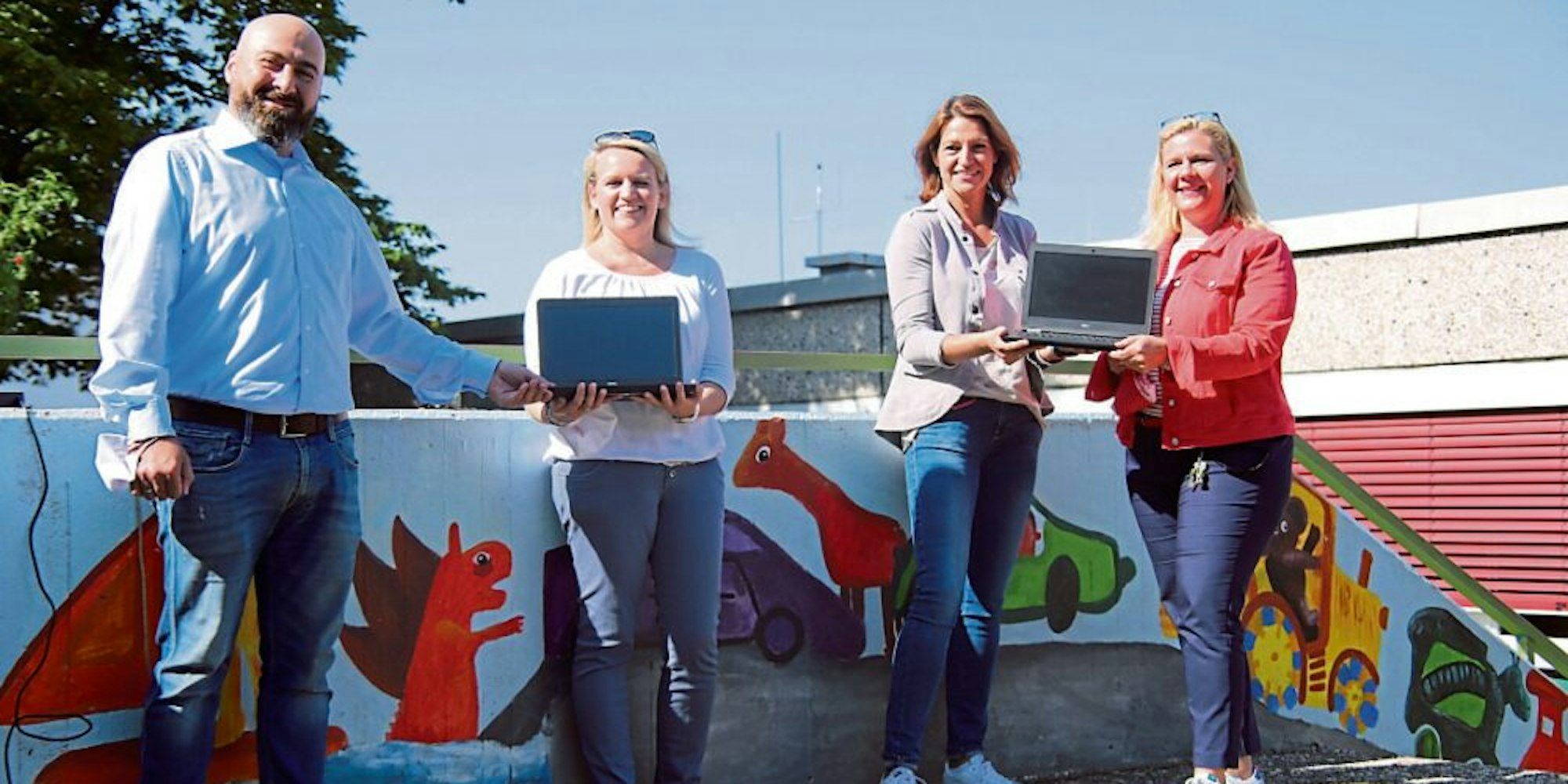 Bei der Übergabe der 20 Business-Laptops: Thorsten Bastian von der Telekom mit Monic Beck, Stephanie Pfeifer und Bettina Urban.