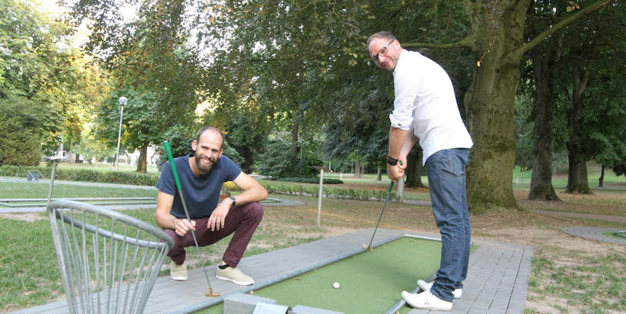 Hennef – Stolz betrachten Max Heller und Wassili Weckauff, was sie erreicht haben. Die beiden stehen auf ihrem knapp 1600 Quadratmeter großen Minigolfplatz im Kurpark.