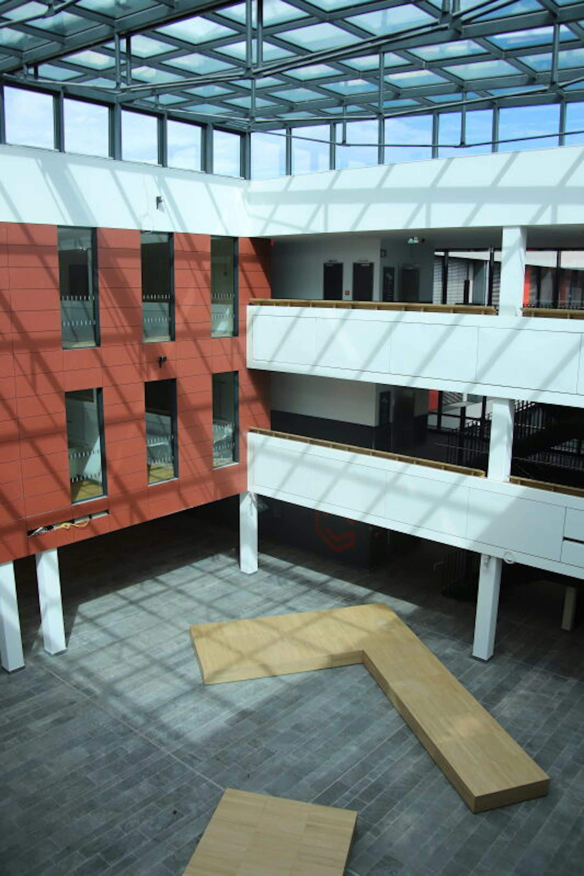 Zentraler Platz ist ein großzügiges Atrium mit einem 16 mal 16 Meter großen Glasdach. Außerdem gibt es einen klar erkennbaren Eingang. Die Fluchtwege wurden neu ausgewiesen, vier zusätzliche Treppenhäuser sind weitere Rettungswege. Neu ist eine Aula, die Mediathek ist größer geworden.
