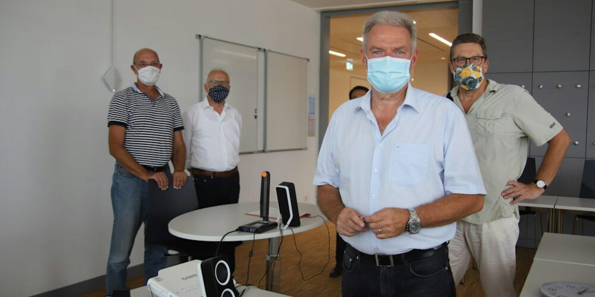 Schulleiter Günter Au (2.v.r.) und Projektleiter Hans-Joachim Geisler (r.) zeigten die Klassenräume.