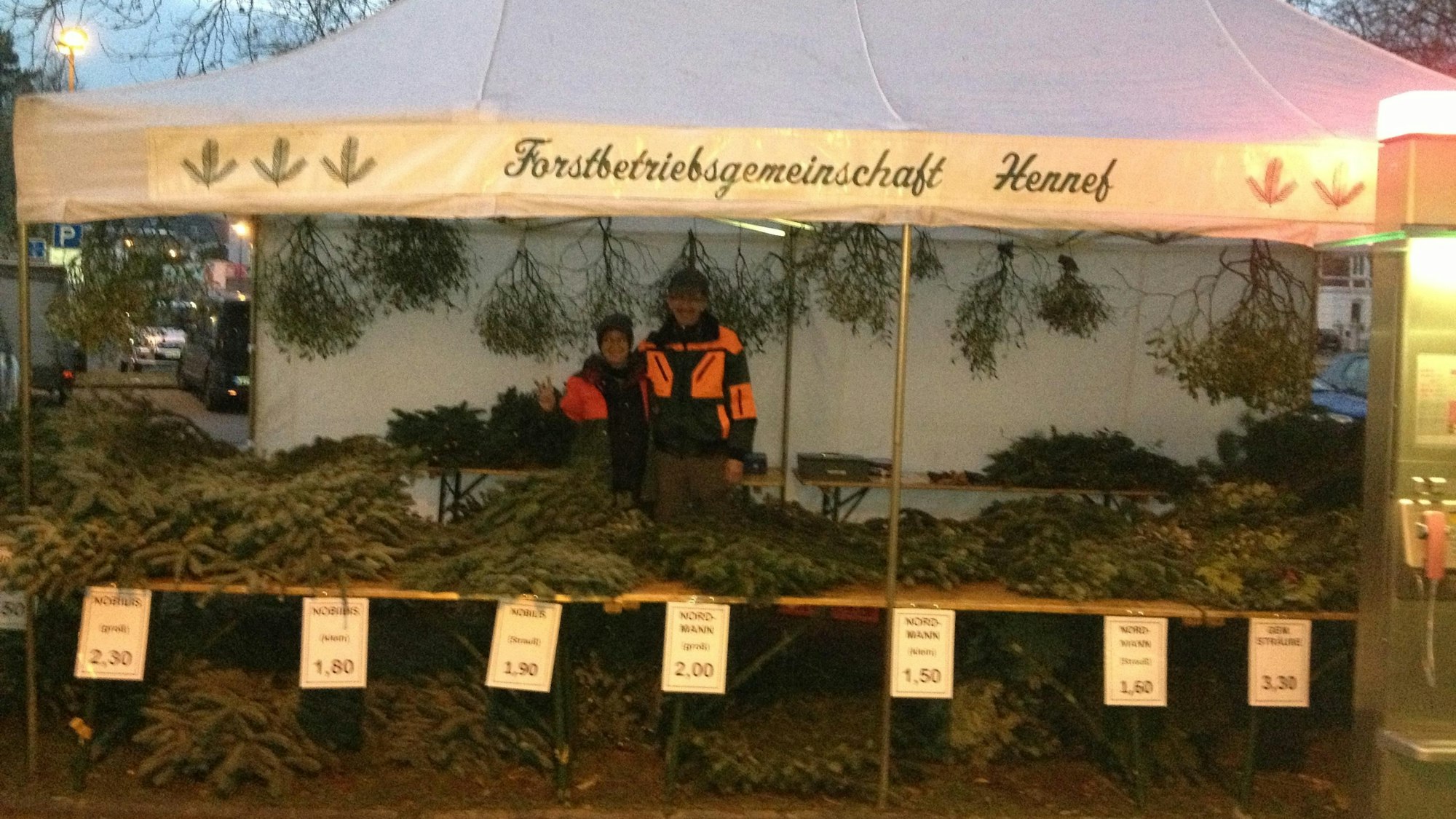 Die Mitglieder der Forstbetriebsgemeinschaft Hennef in ihrem Verkaufsstand: Am 20., 22. und 27. November verkaufen sie von 7 bis 14 Uhr auf dem Heiligenstädter Platz.