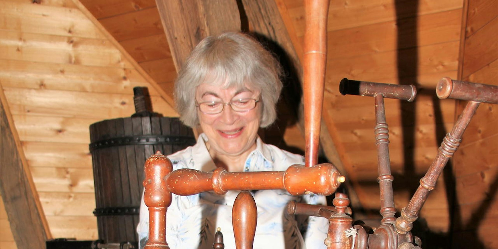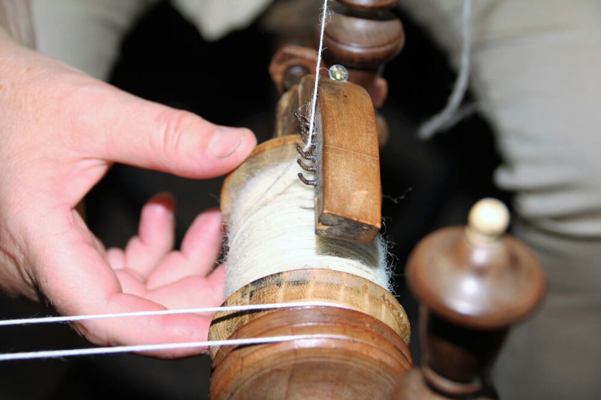 Inge Fischer bedient das uralte Spinnrad, produziert Garn zur Herstellung von Kleidungsstücken.