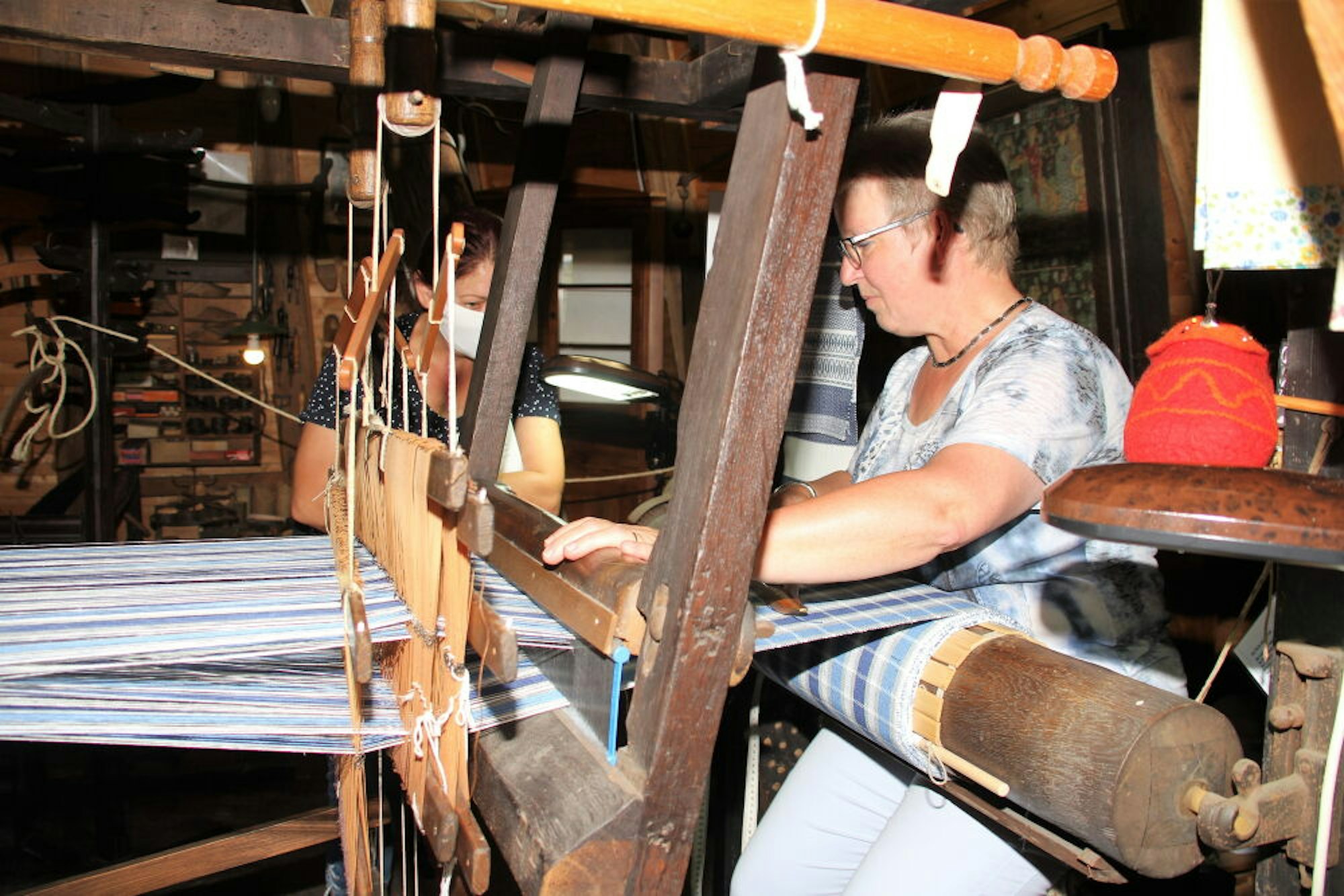 Hobbyweberin Ulrike Broich demonstrierte einer Besucherin des Museums, wie der Webstuhl bedient wird.